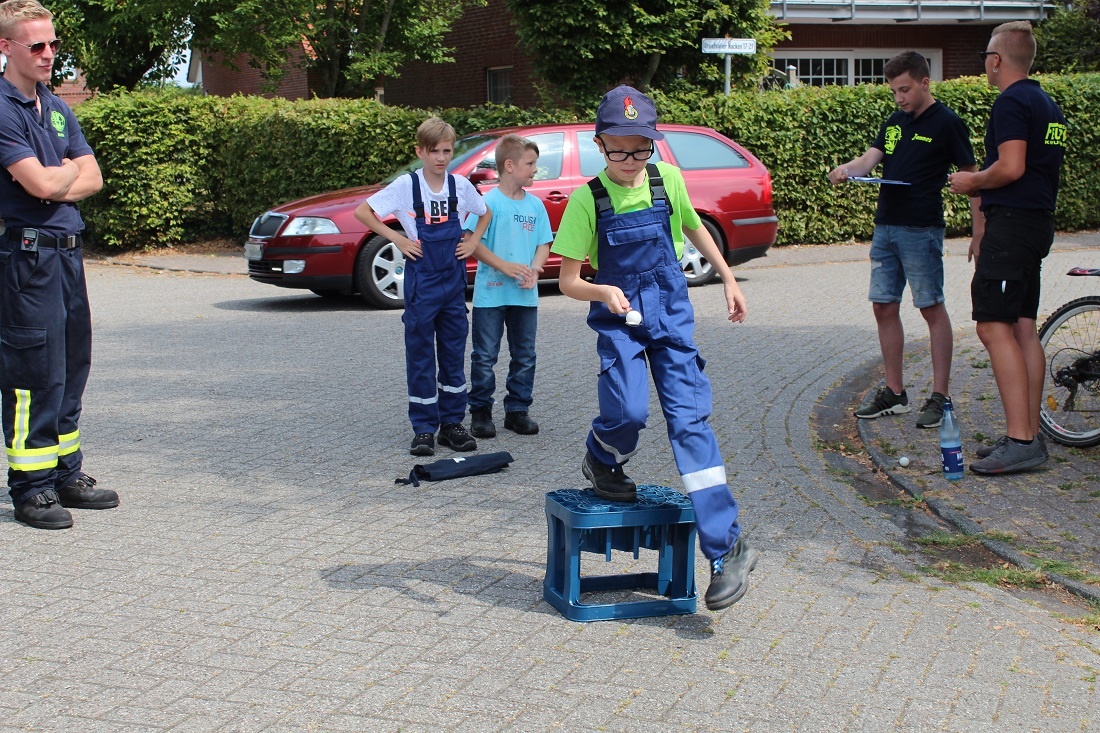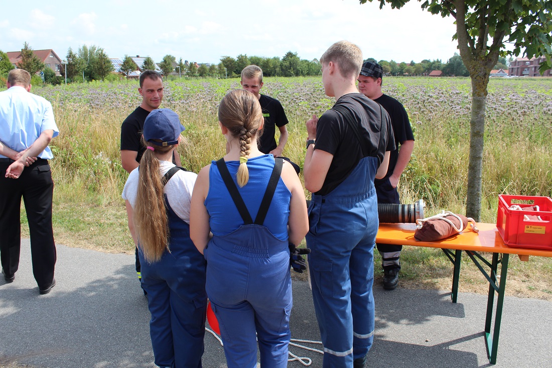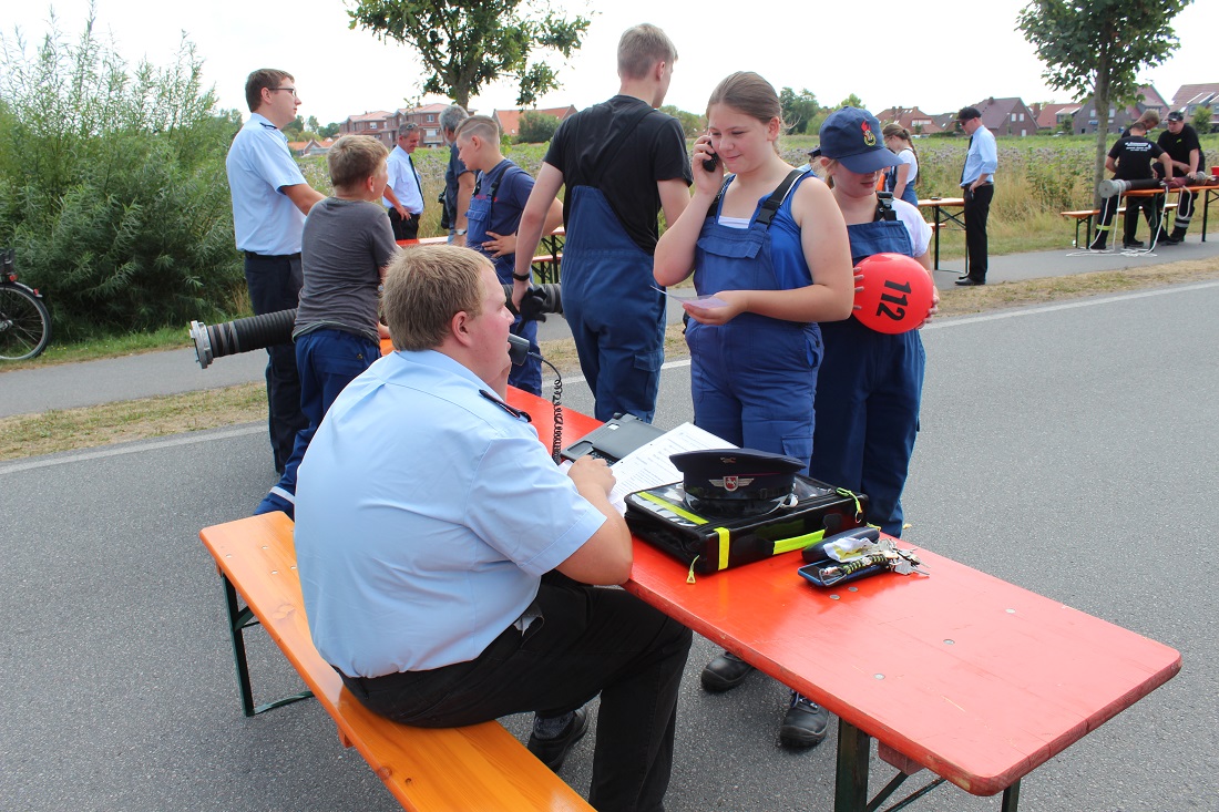 Vor Ort fand auch die Abnahme der Jugendflamme Stufe 1 statt. Dort mussten die Jugendlichen verschiedene Stationen meistern, wie etwa das Absetzen eines Notrufes.