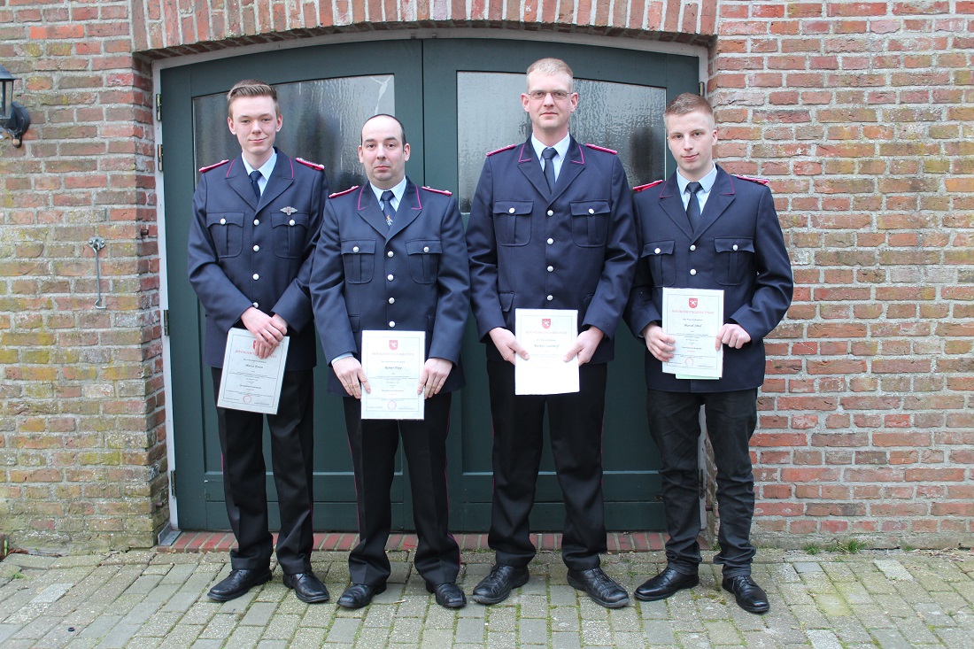 Markus Saadthoff und Marcel Smid wurden durch den stellvertretenden Gemeindebrandmeister Jan-Jürgen Lüpkes zu Oberfeuerwehrmännern befördert. Marco Eeten und Reiner Popp wurden zu Hauptfeuerwehrmännern befördert.