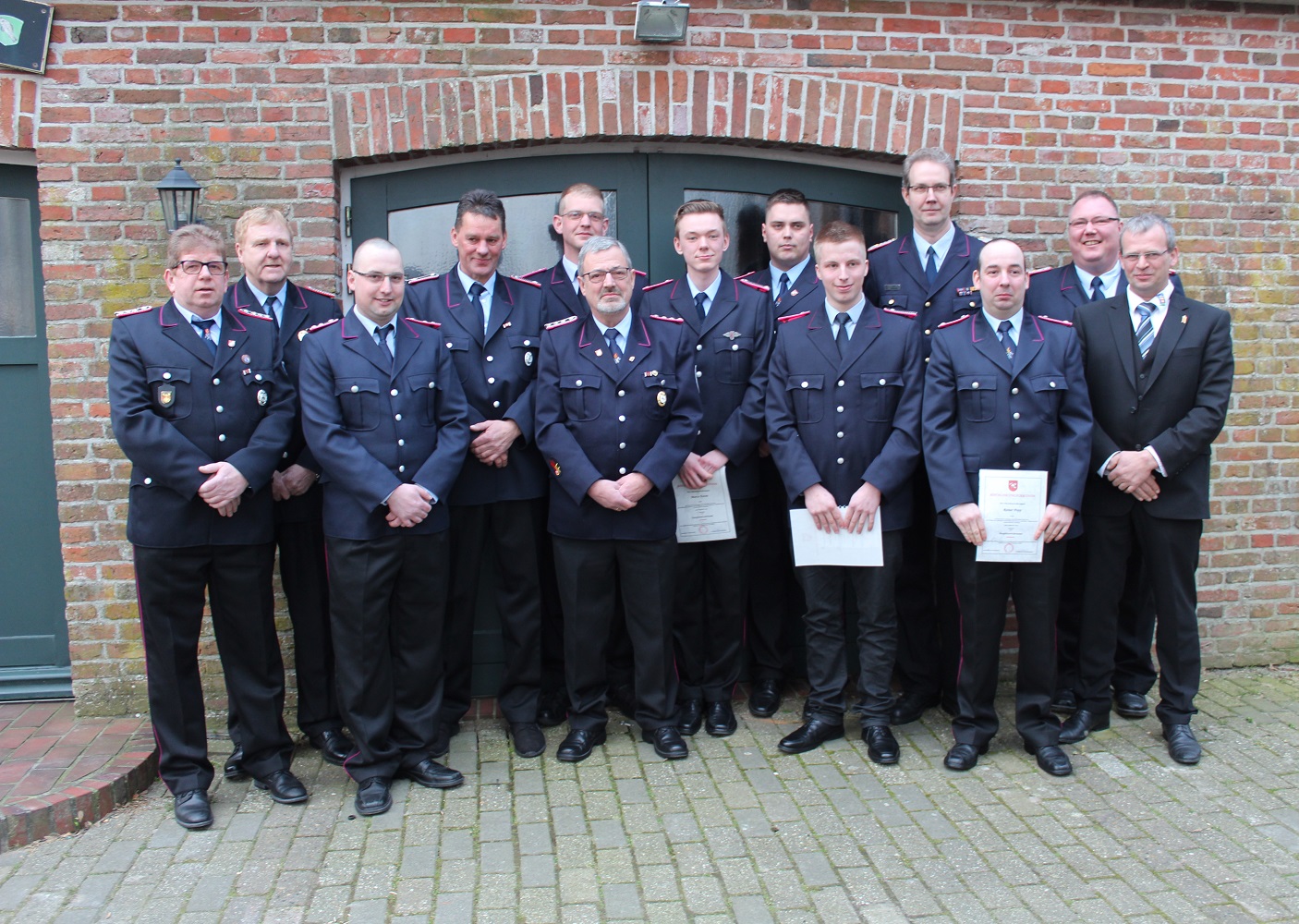Die beförderten und geehrten Feuerwehrleute gemeinsam mit den Führungskräften und dem stellvertretenden Bürgermeister Roelf Odens
