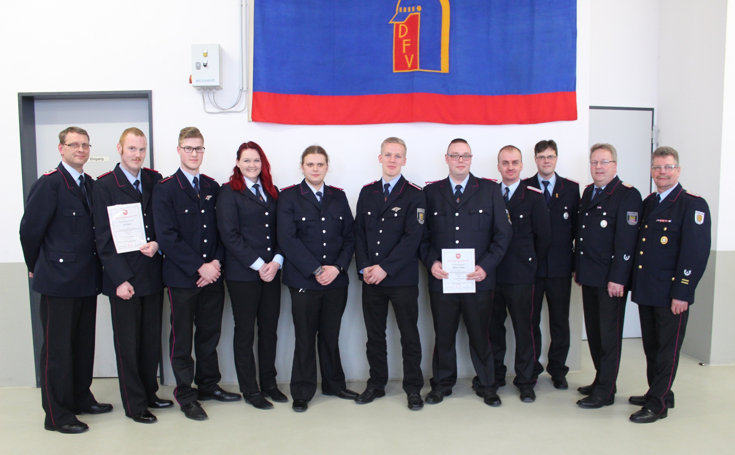 Gemeindebrandmeister Joachim Harberts konnte folgende Beförderungen / Ernennungen durchführen: Rebecka de Wolff zur Feuerwehrfrau, Kai Tjarks zum Feuerwehrmann, Stefan Meyer zum Feuerwehrmann, Torben de Voss zum Feuerwehrmann, Malte Tammen zum Oberfeuerwehrmann und Marwin Lübben zum Hauptfeuerwehrmann.