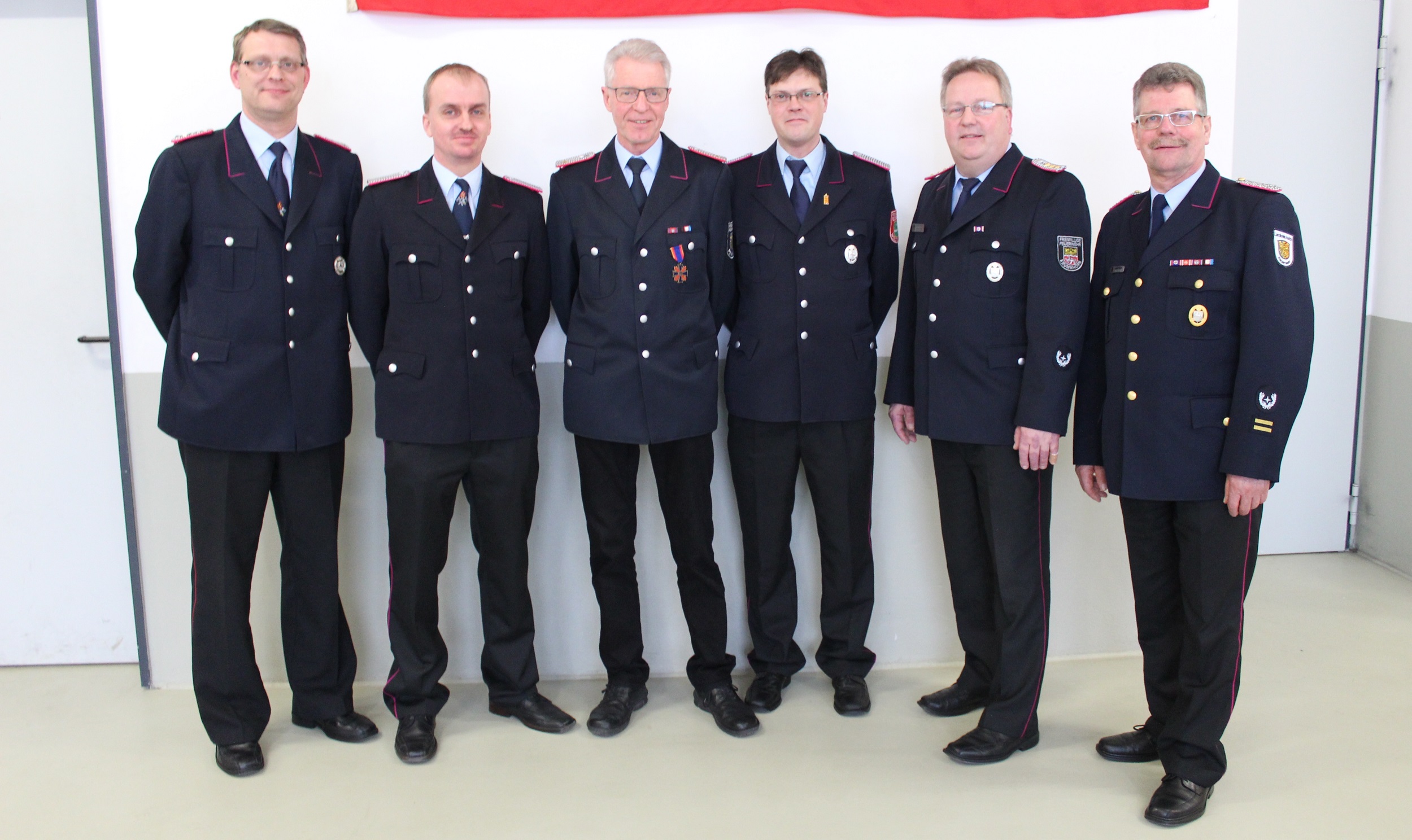 Friedhard Cramer, der mit dem Deutschen Feuerwehr-Ehrenkreuz in Bronze ausgezeichent wurde, gemeinsam mit den Führungskräften