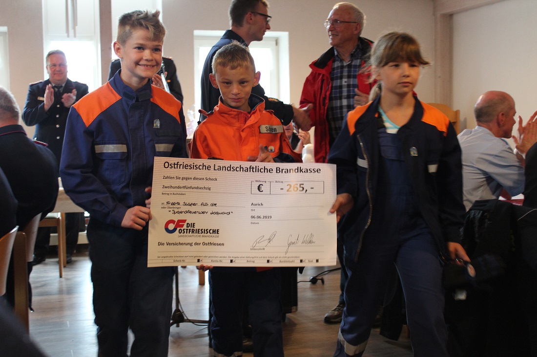 Im Anschluss an die Verleihung übergab Freerk Swyter, der gemeinsam mit seiner Frau bei einem Gewinnspiel der ostfriesischen Brandkasse gewonnen hatte und zudem passives Mitglied in der Feuerwehr Krummhörn-Süd ist, den Gewinn an die Jugendfeuerwehr Krummhörn-Süd. Mit seiner Frau zusammen habe er überlegt, an wen die beiden die Spende richten könnten. "Die Feuerwehr ist ein wichtiges Instrument", so Swyter. Deshalb haben er und seine Frau sich dazu entschieden, die Spende an die Jugendfeuerwehr Krummhörn-Süd zu richten.