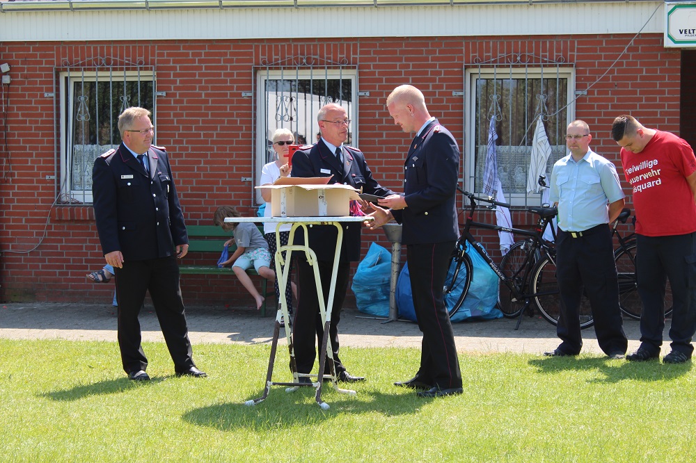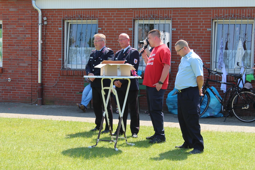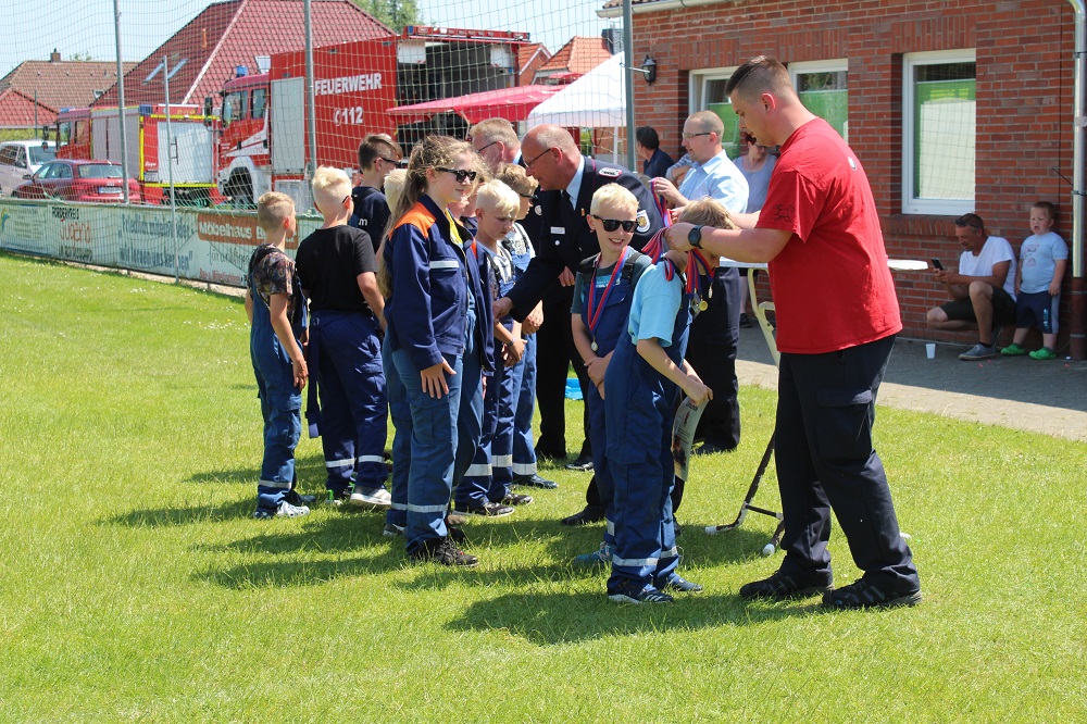 Vor der Siegerehrung verlieh der stellvertretende Kreisjugendfeuerwehrwart Richard Hieronimus das Ehrenzeichen der Niedersächsischen Jugendfeuerwehr für verdienstvolle Tätigkeiten zum Wohle der Jugendfeuerwehr an Henrik Vogelsang. Vogelsang ist stellvertretender Jugendfeuerwehrwart der Jugendfeuerwehr Hamswehrum. "Henrik ist nicht nur für seine Jugendfeuerwehr da, sondern steht stets mit Rat und Tat der Gemeindejugendfeuerwehr zur Seite", so Hieronimus.