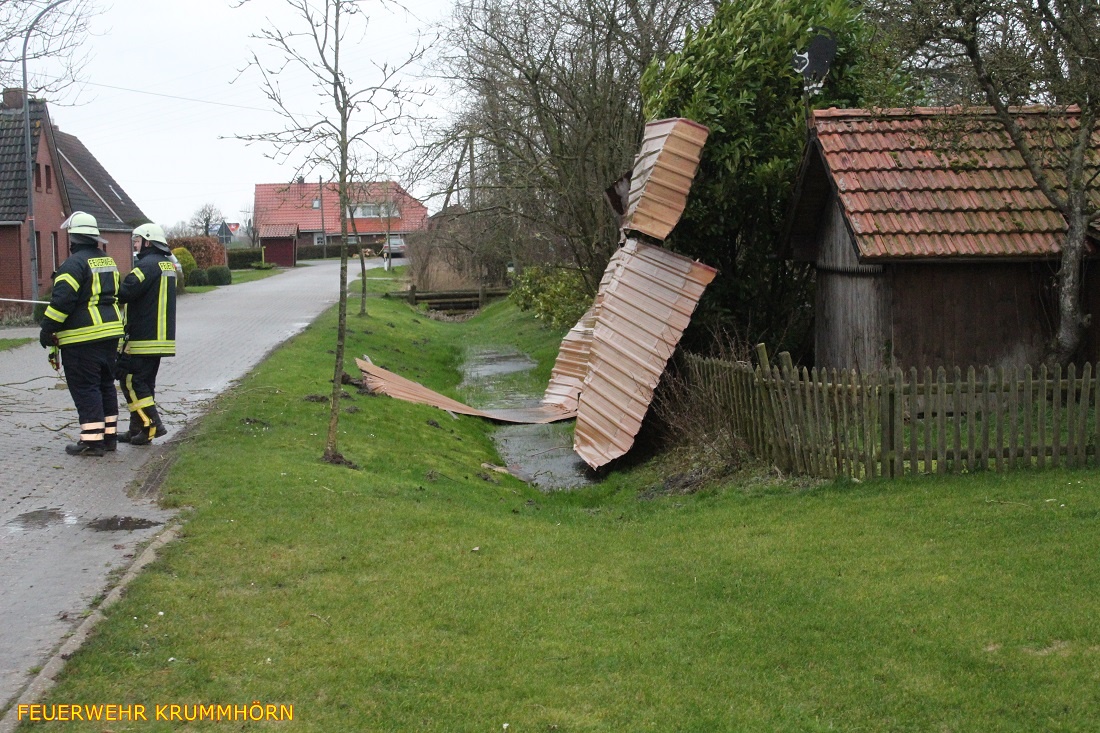 In der Straße Schoonorther Möhlenhörn hat sich aufgrund des Orkans "Sabine" am Sonntagnachmittag ein Dach von einer Halle gelöst. Ein Teil des Daches verfing sich im Geäst eines Baumes, ein weiterer Teil war vom Wind auf die andere Straßenseite geweht worden. Die um 15:29 Uhr alarmierte Feuerwehr Krummhörn-Ost räumte die Dachteile beiseite und sicherte anschließend den Rest des noch vorhandenen Hallendaches. Nach eineinhalb Stunden war der Einsatz beendet.