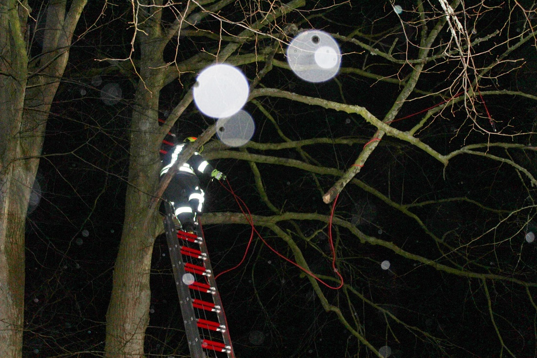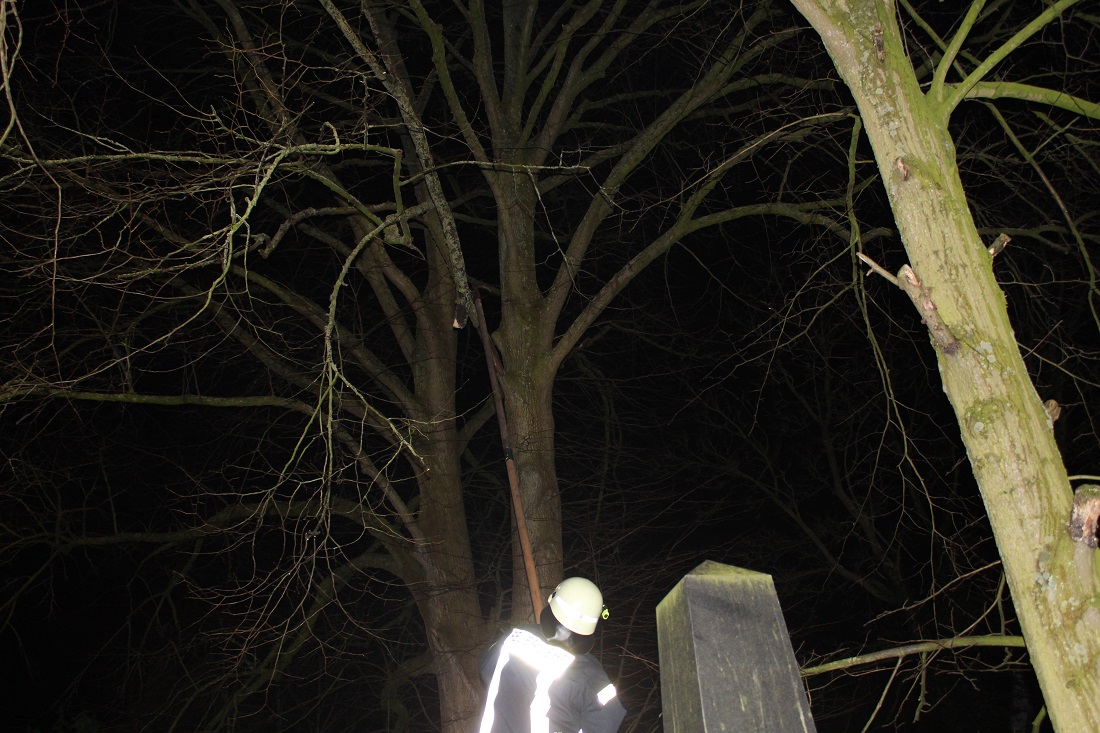 Zur Beseitigung einer Gefahrenstelle an der Pewsumer Kirche rückte die Feuerwehr Pewsum-Woltzeten mit zwei Fahrzeugen am Montagabend um 19:05 Uhr aus. Ein Ast, der wegen des Unwetters abbrach, war in dem Baum hängen geblieben und stellte somit eine Gefahr für Fußgänger dar. Die Einsatzkräfte versuchten zunächst diesen mit Hilfe eines Einreißhakens herunterzuholen. Dies gelang auf Grund der schwierigen Lage des Astes jedoch nicht. Letztlich wurde die Schiebleiter vorgenommen und mit Hilfe einer Leine konnte der Ast entfernt und die Gefahrenstelle somit beseitigt werden.