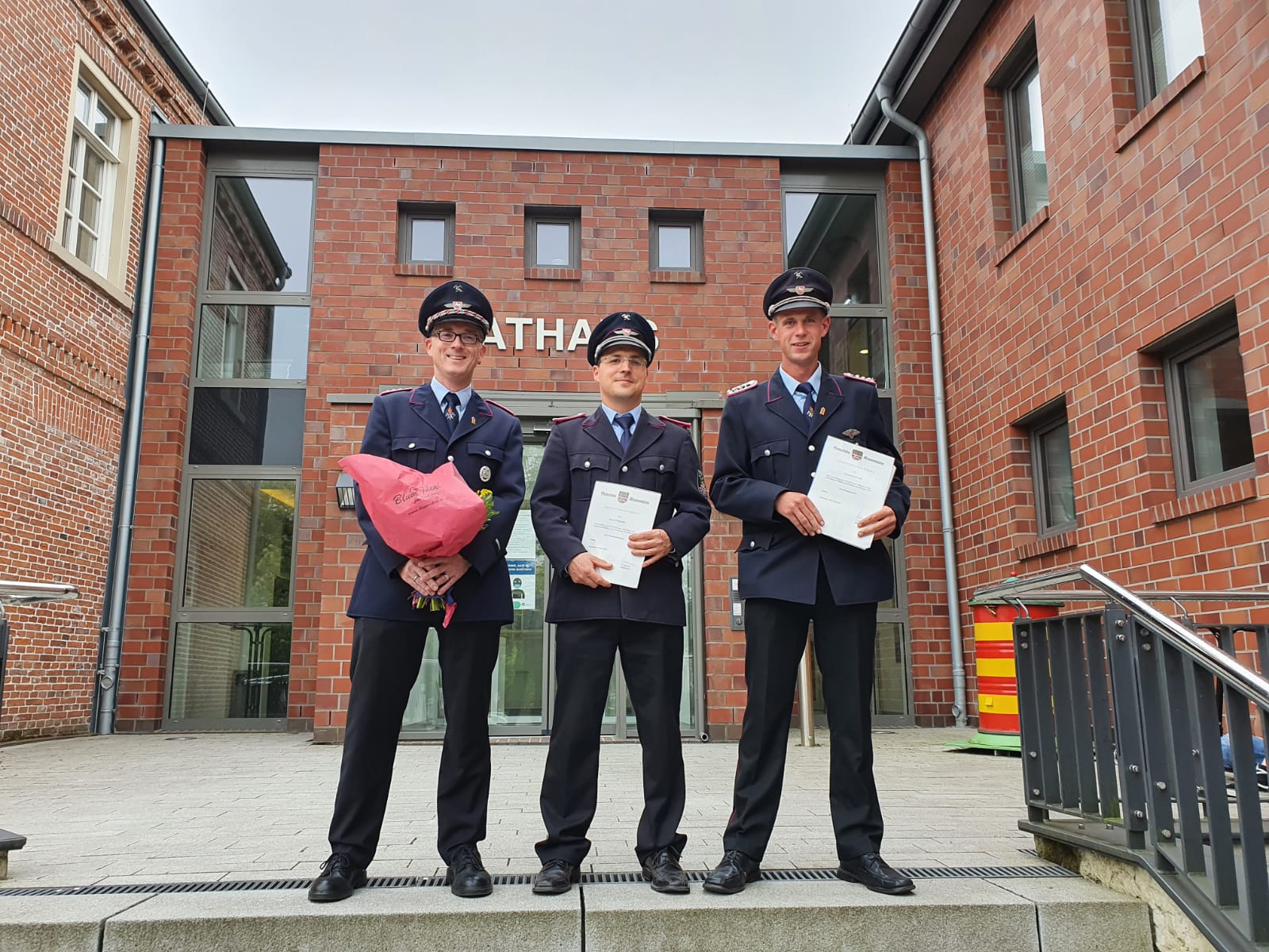 Auf dem Bild von links nach rechts: Holger Fransen (ehemaliger erster stellv. Ortsbrandmeister), Florian Burgstaller (neu eingesetzter erster stellv. OrtsBM), Christian Iwwerks (neu eingesetzter Ortsbrandmeister)