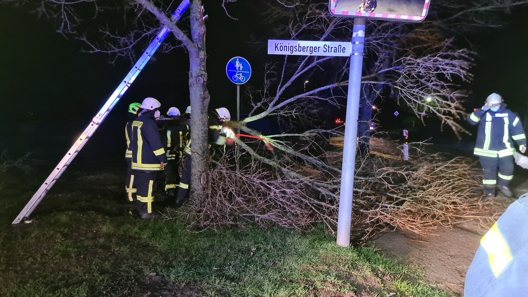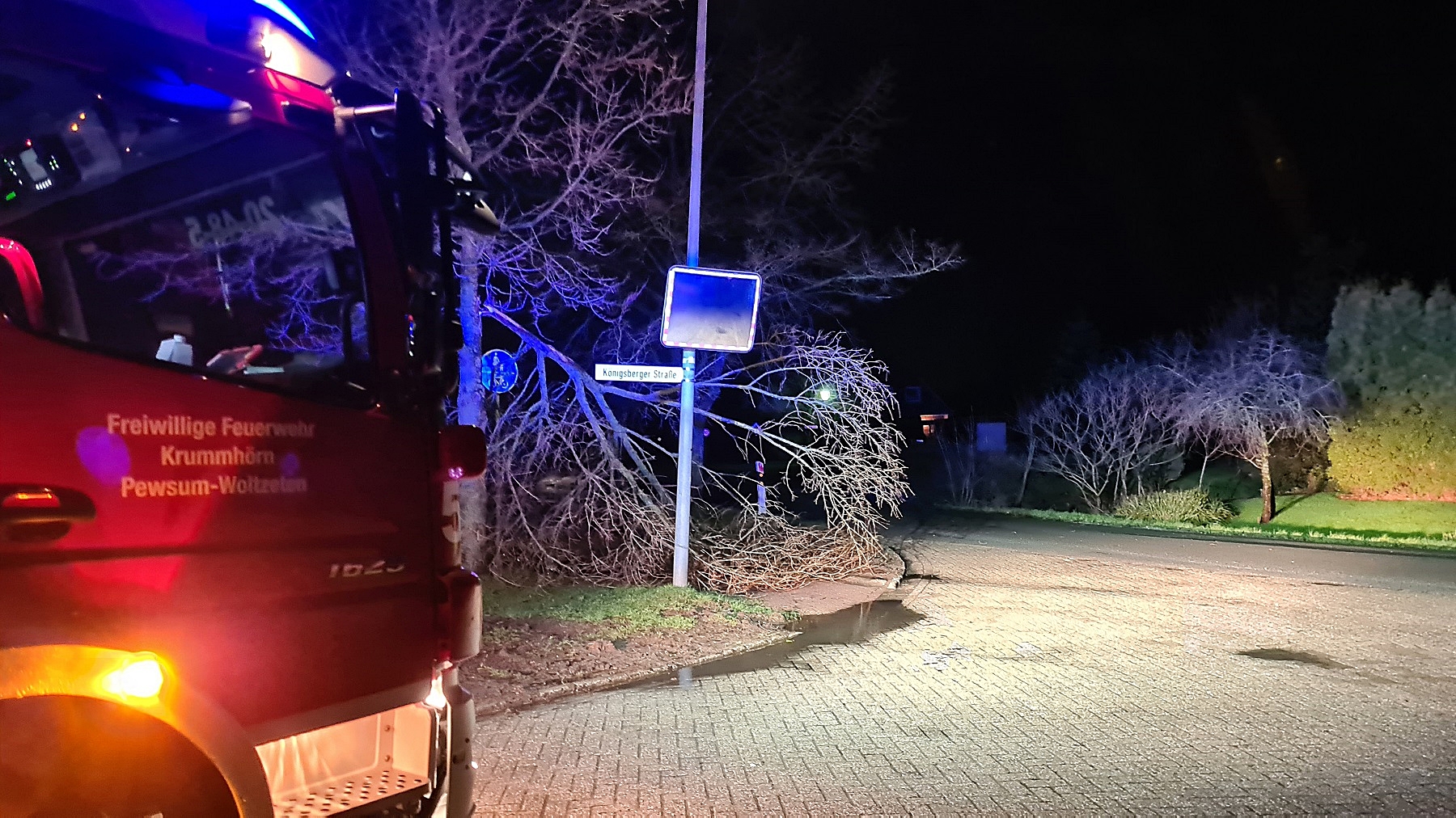 Den Anfang machte am Mittwochabend, gegen 22:40 Uhr, ein Sturmschaden in der Woltzetener Straße, Ecke Königsberger Straße in Pewsum. Dort war ein Ast abgeknickt und versperrte den dortigen Rad-/Fußweg. Die eingesetzte Feuerwehr Krummhörn-Mitte konnte die Gefahr mit einer Bügelsäge und Muskelkraft schnell beseitigen.