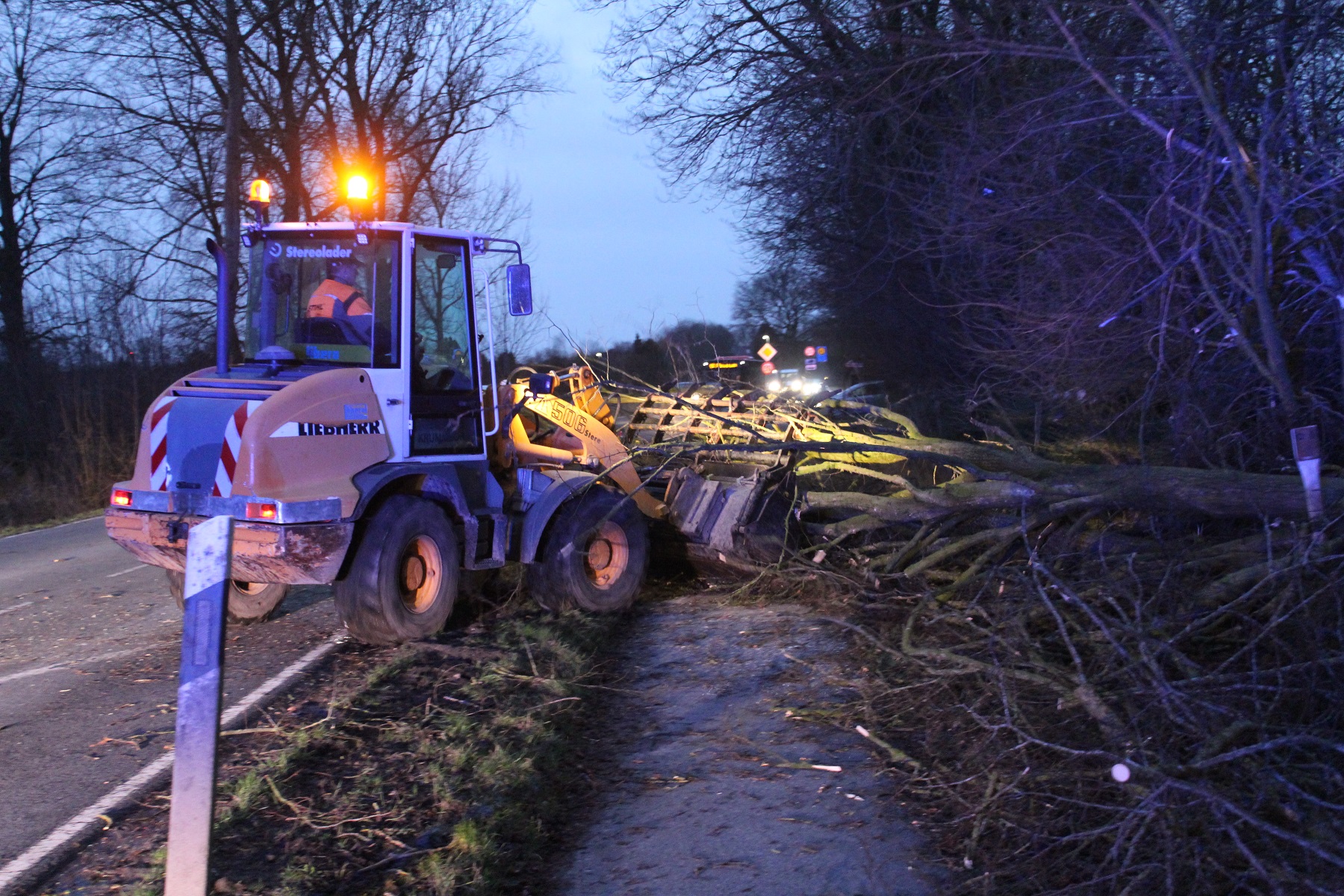 Nur wenige Minuten später kam es zu einem Sturmschaden zwischen Loquard und Rysum. Dort blockierte ein umgestürzter Baum den Rad-/Fußweg und einen Teil der Fahrbahn. Mit Motorkettensägen und Unterstützung eines Radladers vom Bauhof konnte der Baum von der Besatzung des HLF Krummhörn-Mitte und KLF Krummhörn-Süd entfernt werden.