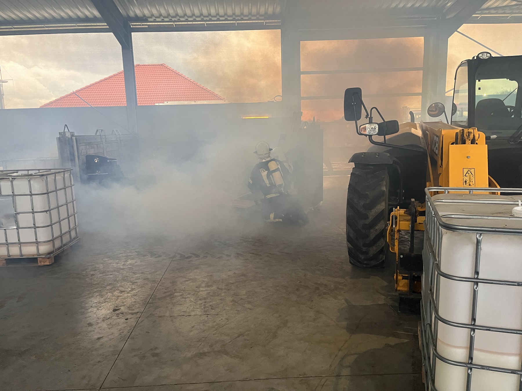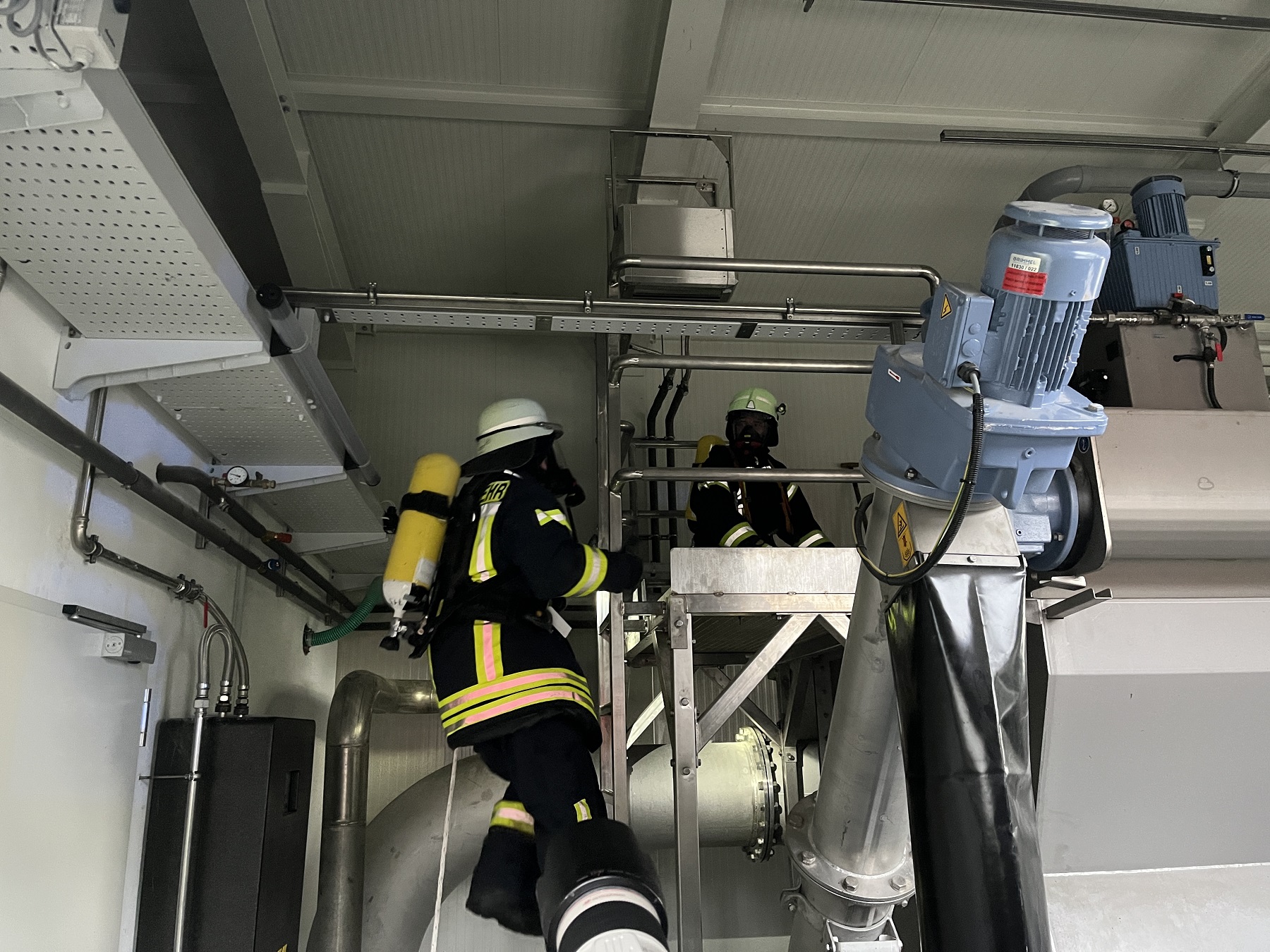 Ein Szenario beinhaltete ein Brandereignis mit vermissten Personen in der Schlammlagerhalle des Klärwerks. Insgesamt drei Personen mussten aus der Halle gerettet werden. Eine Nebelmaschine simulierte die Rauchentwicklung.