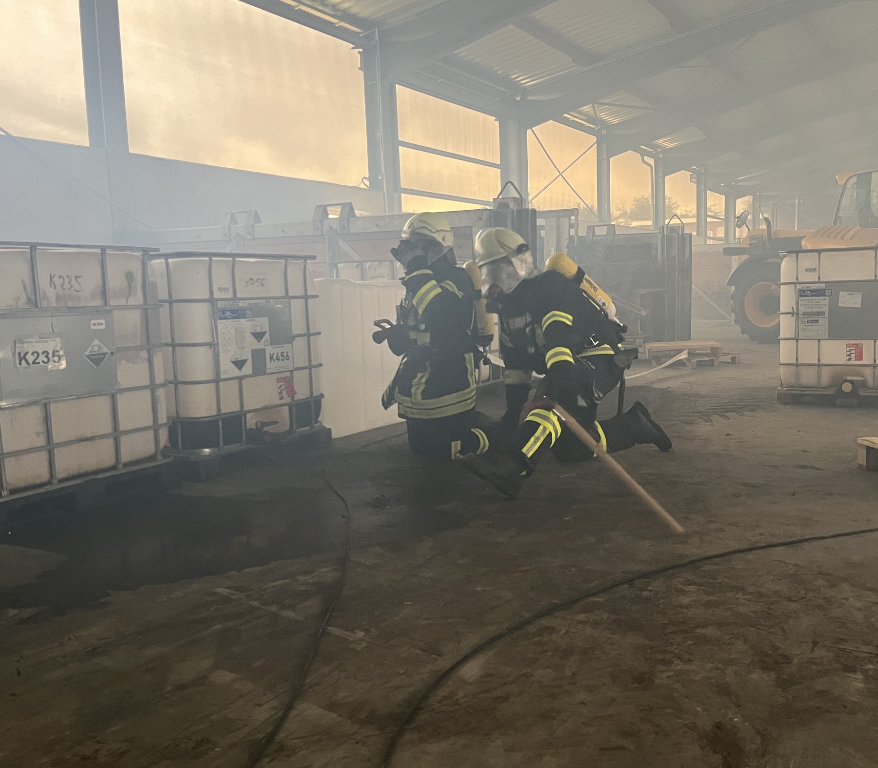 Trupps unter Atemschutz gingen in die Halle vor und retteten alle drei Personen aus der Halle. Zur Wasserversorgung nutzten die Feuerwehren eine Wasserentnahmestelle auf dem Gelände.