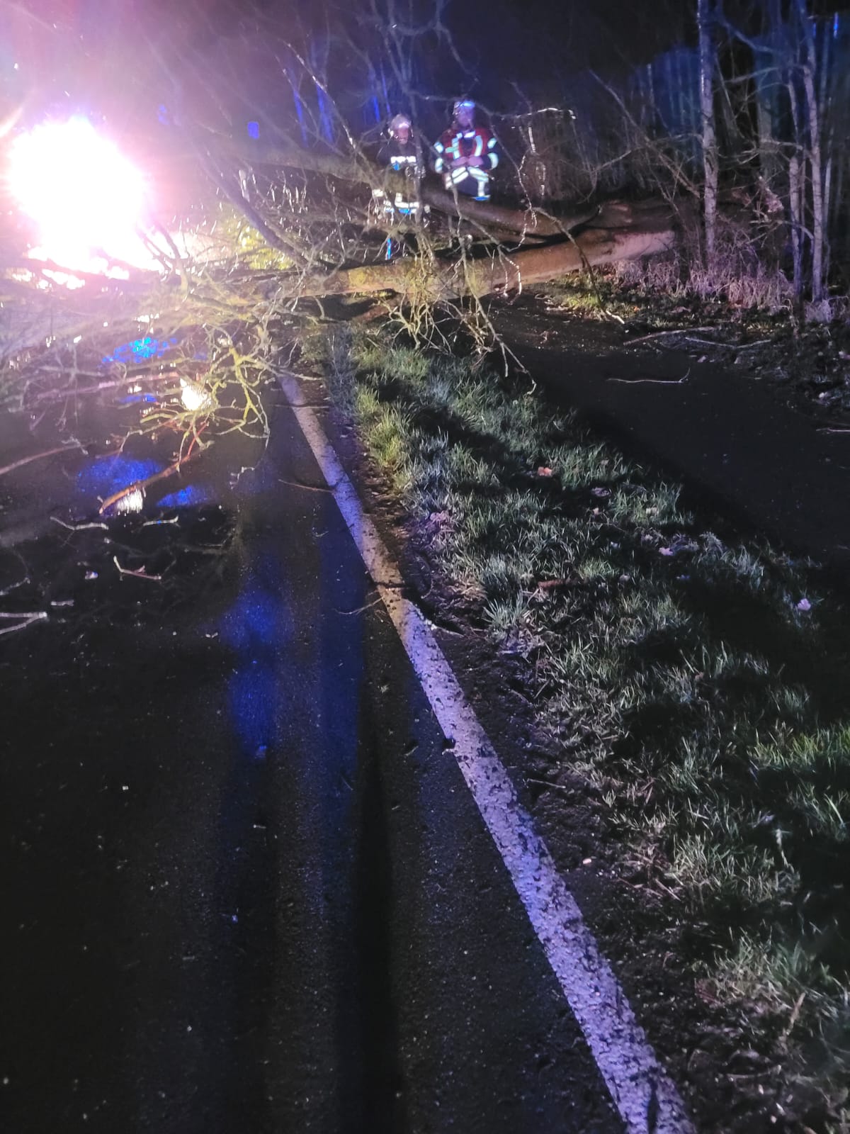 -01:18 Uhr: Landesstraße - Großer umgestürzter Baum, Fahrbahn komplett blockiert