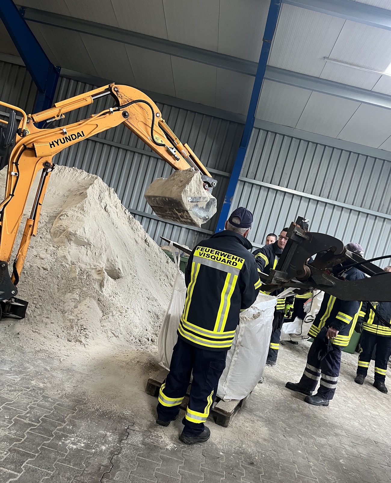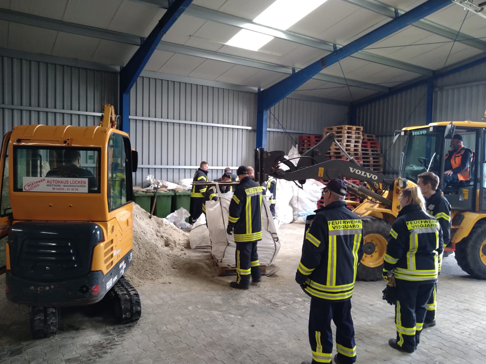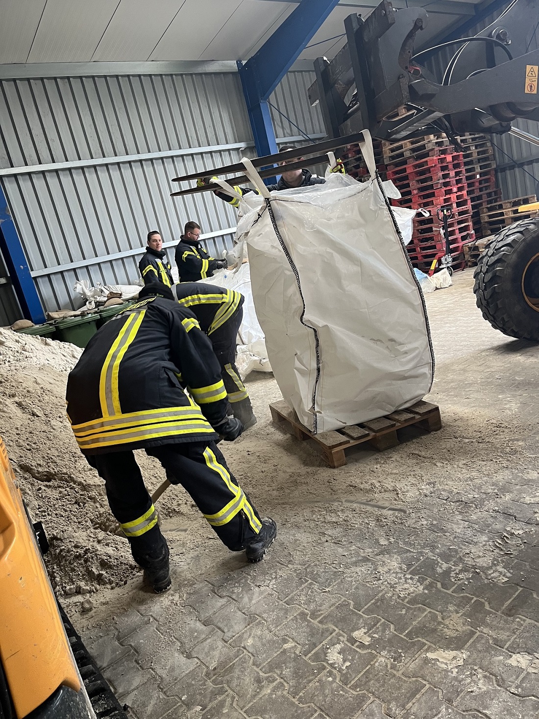 Im Rahmen der Kreisfeuerwehrbereitschaft waren die beiden Krummhörner Feuerwehren gemeinsam mit den Feuerwehren Lütetsburg und Hagermarsch dort und befüllten in einer Halle Sandsäcke für den Notfall. Im Bedarfsfall kommen diese von dort aus zum Einsatz.
