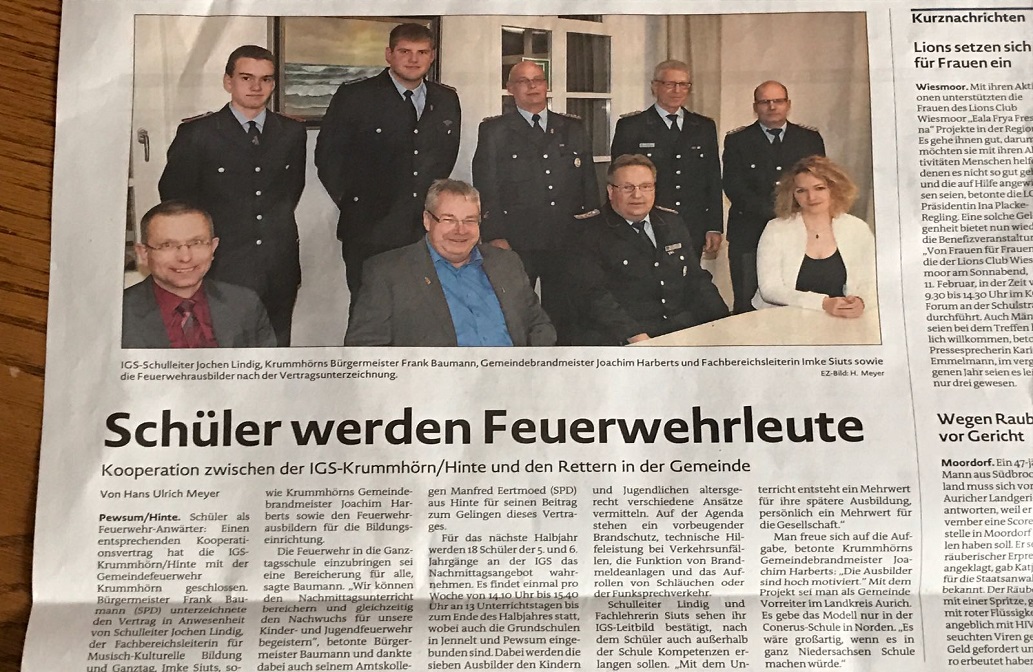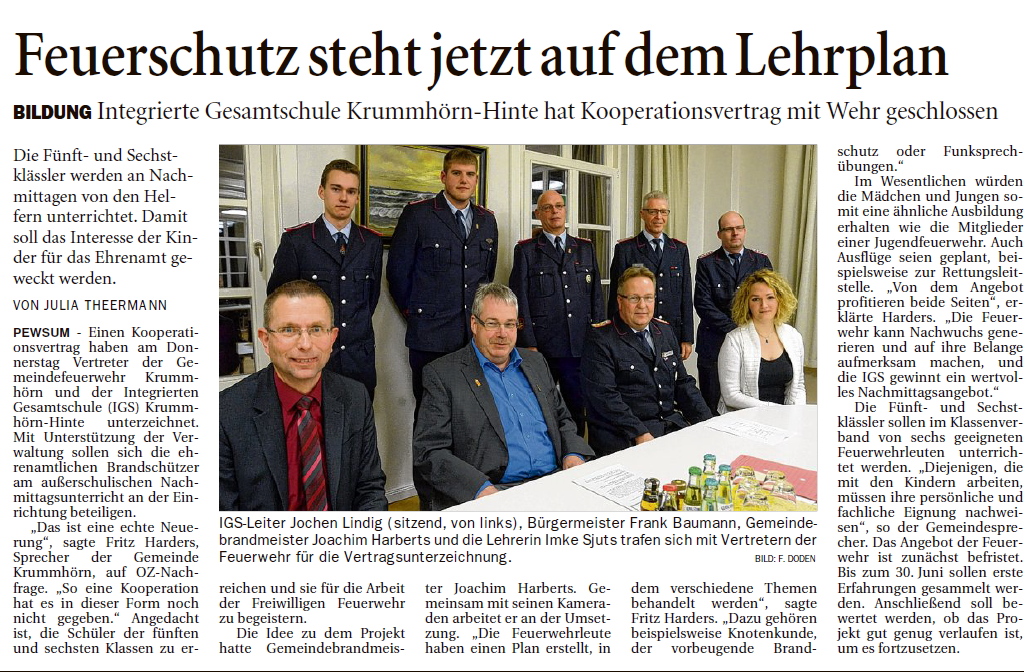In diesem Kooperationsvertrag wurde die Arbeit zwischen Feuerwehr und IGS Krummhörn besiegelt. Bereits 2015 trat der Gemeindebrandmeister der Gemeindefeuerwehr Krummhörn an die integrierte Gesamtschule Krummhörn heran, um die Arbeit der Feuerwehr in einer solchen Form heranzutreiben. In den einzelnen Feuerwehren der Gemeinde Krummhörn wurden 7 Ausbilder gefunden, welche dann jeden Dienstagnachmittag ehrenamtlich den Schülerinnen und Schülern das Thema Feuerwehr im Rahmen der Fachlernzeit näher bringen.