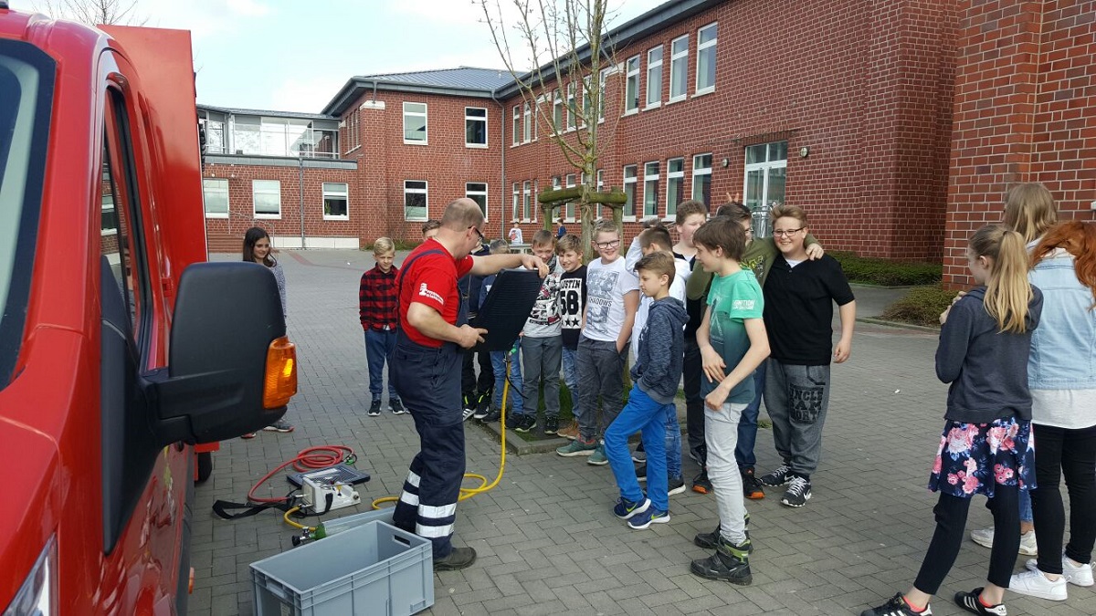 Im Anschluss ging es für 30 Minuten auf den Schulhof der IGS Krummhörn. Dort wurde den Schülern der Gerätewagen - Technische Hilfeleistung der Ortsfeuerwehr Campen-Upleward gezeigt und dessen Einsatzbereich näher erläutert. Danach konnten die Schülerinnen und Schüler mit 4 Übungsfeuerlöschern praktische Erfahrungen im Umgang mit dem Feuerlöscher sammeln.
