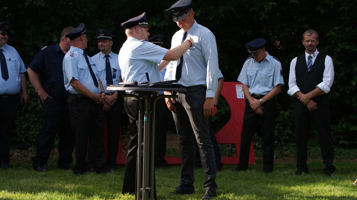 Bei der Eröffnung des Zeltlagers vollzog Kreisjugendfeuerwehrwart Stephan Christel zwei besondere Ehrungen.