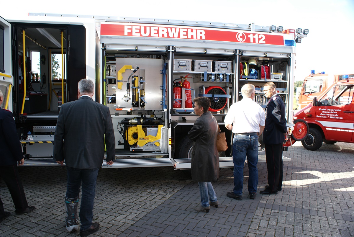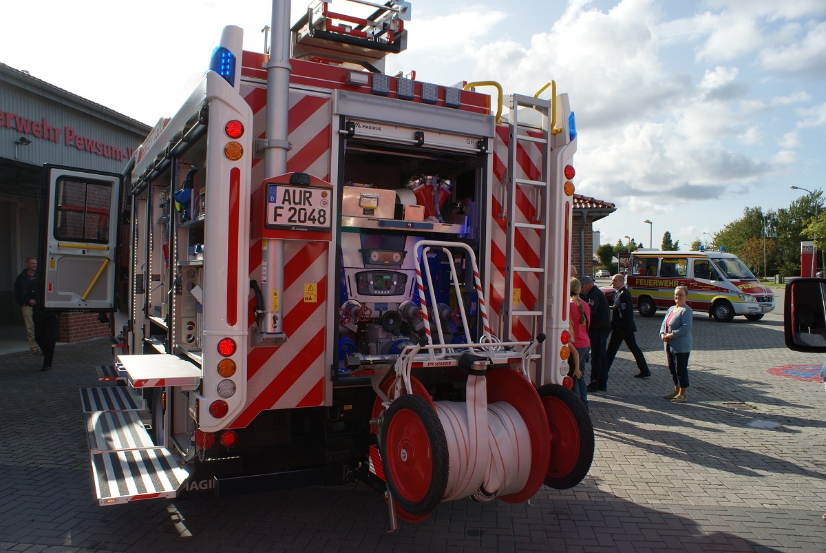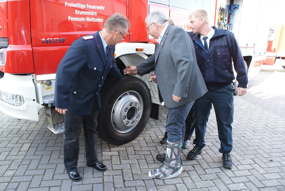 Der Bürgermeister der Gemeinde Krummhörn, Frank Baumann, übergab den Schlüssel des neuen Fahrzeuges an Gemeindebrandmeister Joachim Harberts. "Etwa anderthalb Jahre musste die Ortsfeuerwehr Pewsum - Woltzeten auf das neue Fahrzeug vom Ratsbeschluss bis zur Auslieferung warten", so Baumann. "Das neue Hilfeleistungslöschgruppenfahrzeug hat etwa 340 000 € gekostet. Das ist eine Menge Geld, aber die bestmögliche Ausrüstung für unsere Feuerwehr ist uns, dem Rat, der Gemeinde und mir persönlich wichtig", betonte Baumann. Gemeindebrandmeister Joachim Harberts übernahm den Schlüssel für das neue Fahrzeug der Ortsfeuerwehr und berichtete, dass das Fahrzeug bereits erste Einsätze gefahren sei. Wie zuletzt einen schweren Verkehrsunfall zwischen Loquard und Rysum. Joachim Harberts übergab den Schlüssel nach seiner Rede an den Ortsbrandmeister der Ortsfeuerwehr Pewsum - Woltzeten, Peter Tammen. Traditionell wurden alle vier Reifen mit Schnaps begossen.