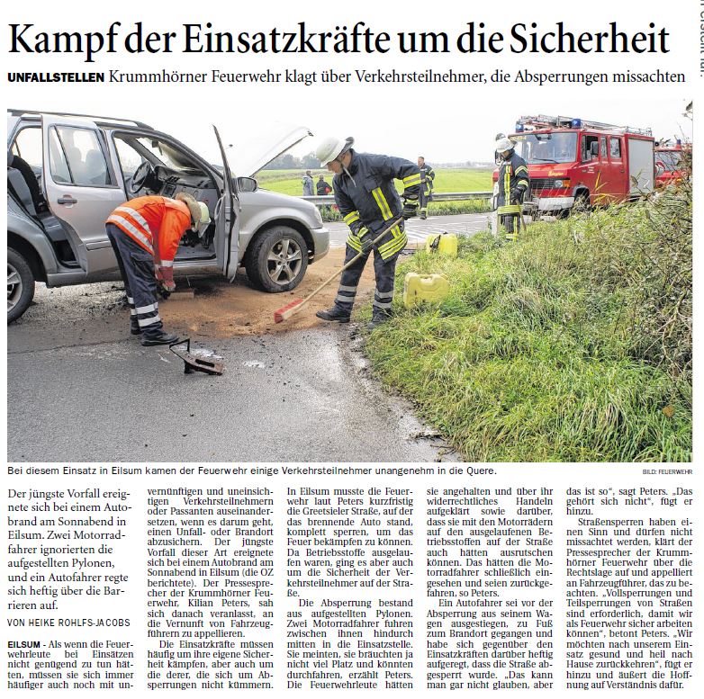 Der Grund dafür: Mehrere Verkehrsteilnehmer missachteten Absperrungen während eines Feuerwehreinsatzes. Neben der örtlichen Presse berichtete auch "Radio Ostfriesland" über dieses gefährdende Ereignis.