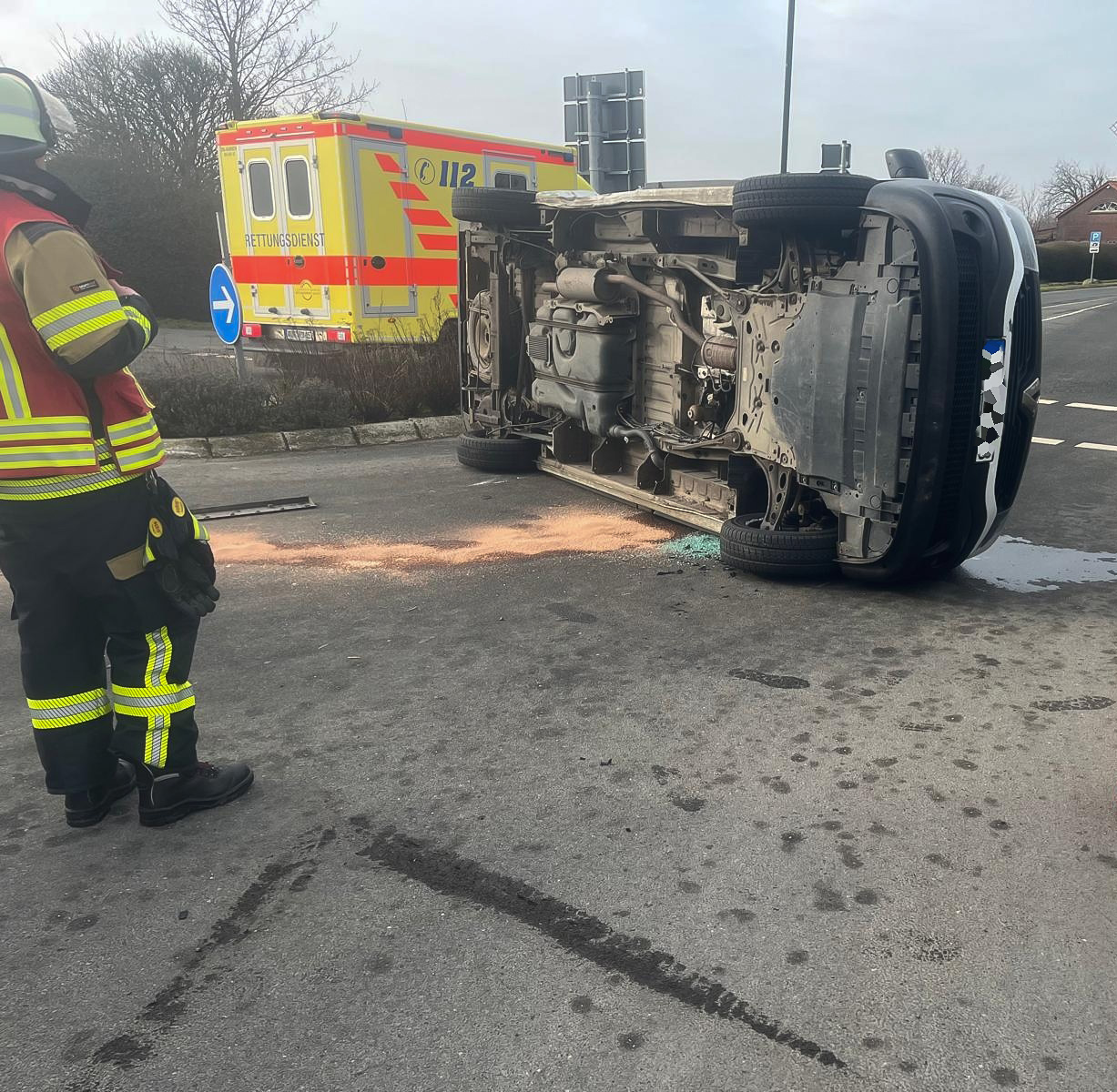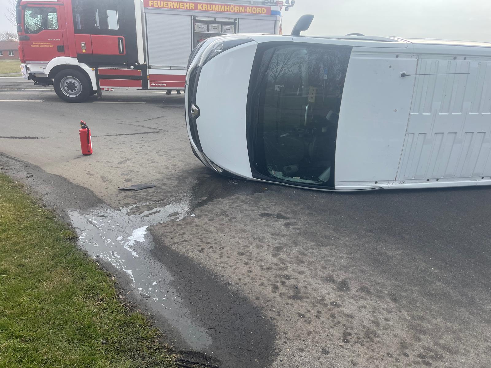 Im Kreuzungsbereich der Greetsieler Straße und der Mühlenstraße waren zwei Fahrzeuge miteinander kollidiert. Infolge des Zusammenstoßes kippte ein Transporter auf die Seite. Die darin befindliche Person konnte das Fahrzeug selbstständig verlassen.