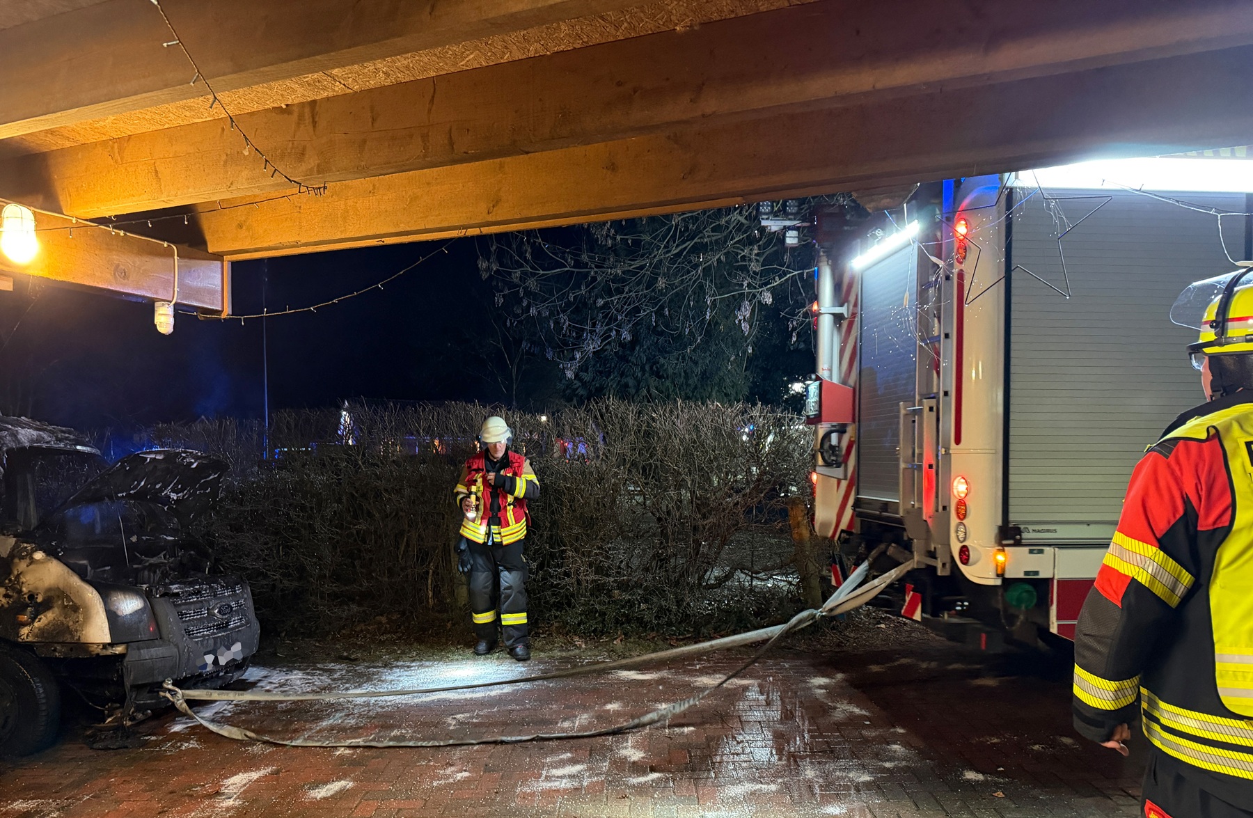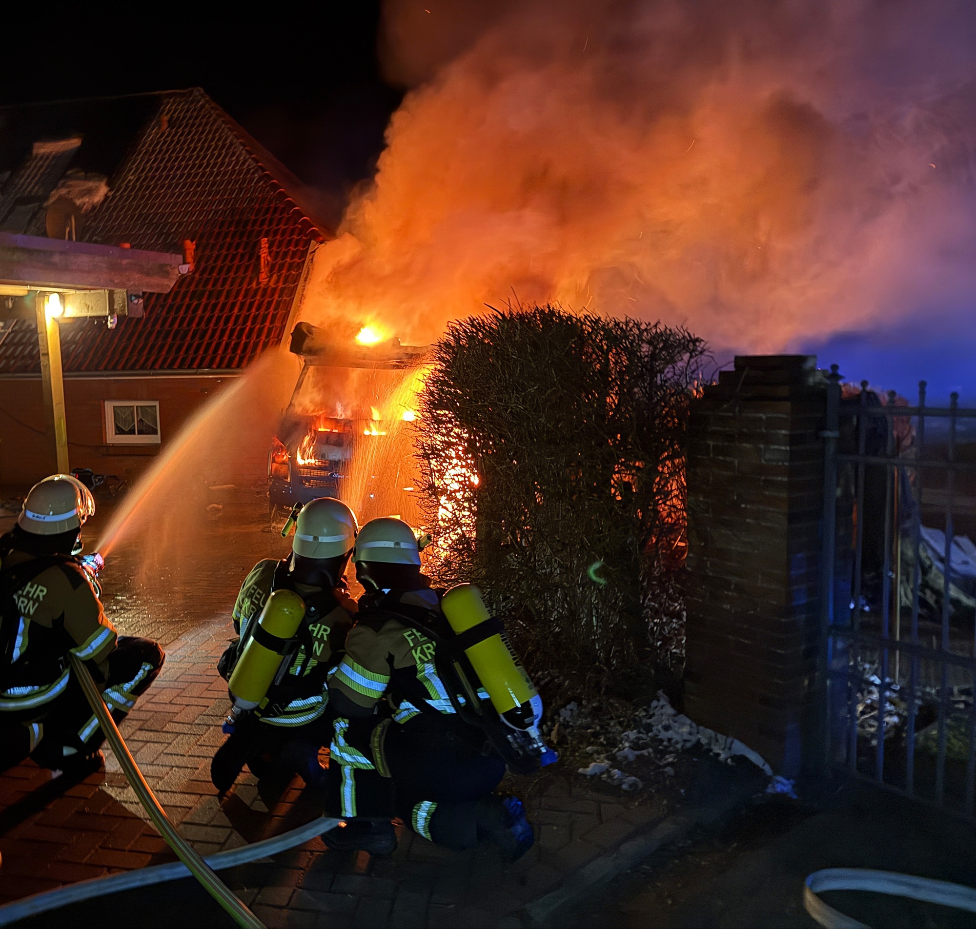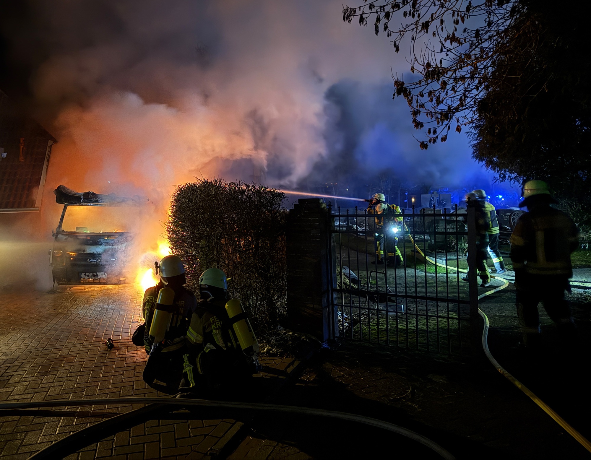 Beim Eintreffen der ersten Einsatzkräfte stand das Fahrzeug bereits in Vollbrand. Aufgrund der unmittelbaren Nähe zu einem Wohngebäude bestand die Gefahr eines Übergreifens der Flammen.