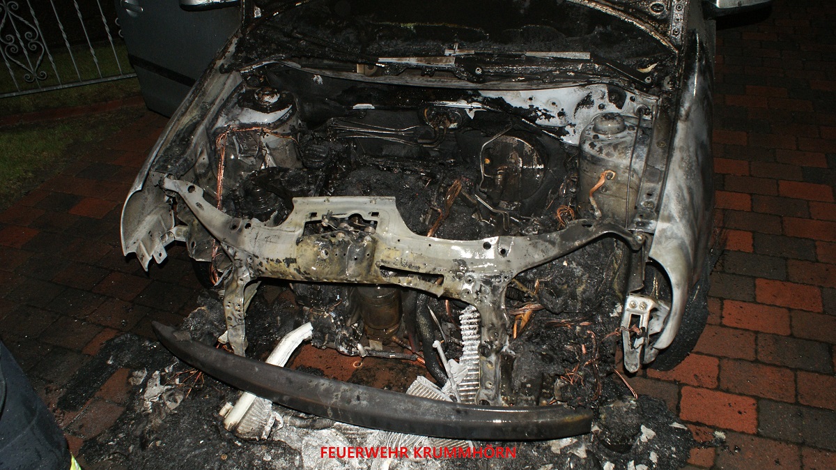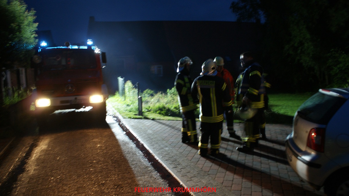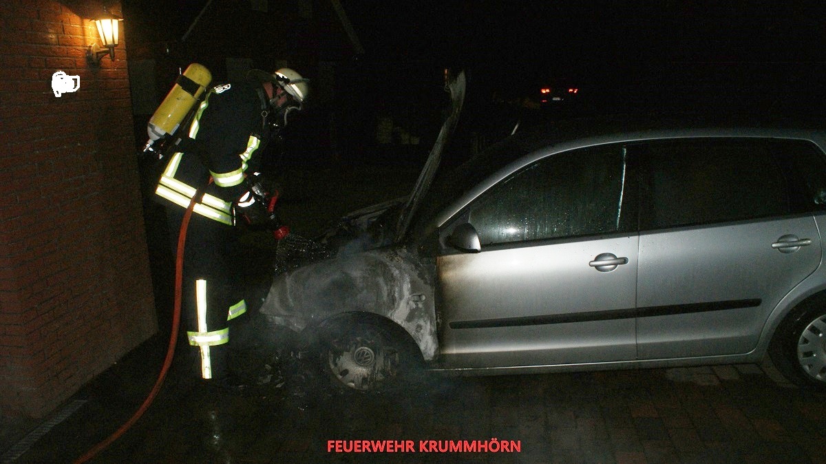 In der Nacht zu Mittwoch wurden die Feuerwehren Pewsum - Woltzeten und Loquard - Rysum gegen halb vier mit dem Stichwort "Garagenbrand" in die Brunger Straße in Loquard alarmiert. Vor Ort brannte ein Fahrzeug vor einer Garage. Ein Trupp unter schwerem Atemschutz löschte den Brand mittels Schnellangriff ab. Der Brand war schnell unter Kontrolle. Die ebenfalls angerückte Feuerwehr Pewsum - Woltzeten brauchte nicht mehr tätig werden und konnte wieder abrücken. Durch das Feuer wurde der Motorraum des PKWs sehr in Mitleidenschaft gezogen. Neben der Feuerwehr war auch die Polizei an der Einsatzstelle.