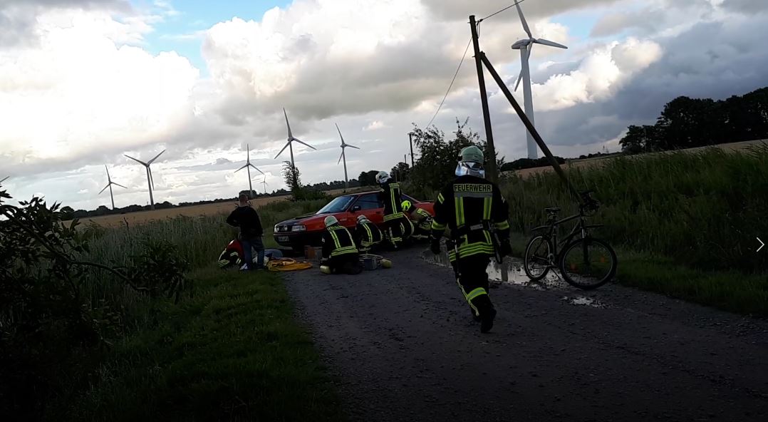 Auf dem Weg zur Einsatzstelle wurde ein Unfall mit einem Radfahrer vorgefunden. Zusammen mit dem Tanklöschfahrzeug und dem Einsatzleitwagen der Feuerwehr Pewsum/Woltzeten wurde der Verletzte versorgt. Der PKW wurde mittels Hebekissen angehoben und unterbaut. Anschließend konnte man den Patienten mittels Schaufeltrage unter dem Fahrzeug befreien und auf eine Trage lagern.