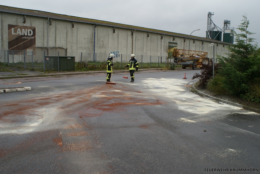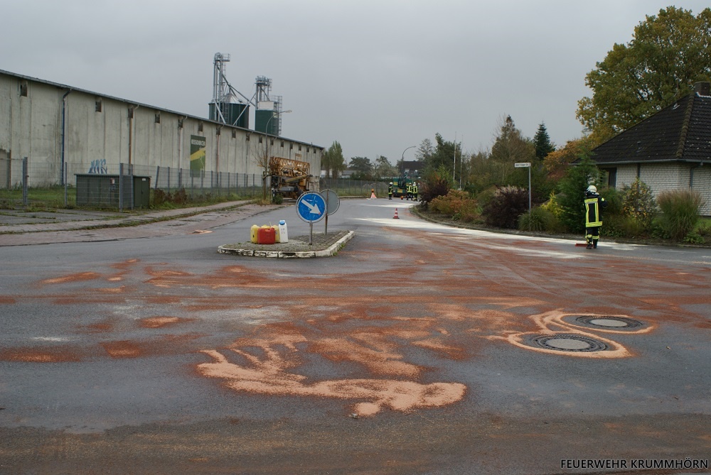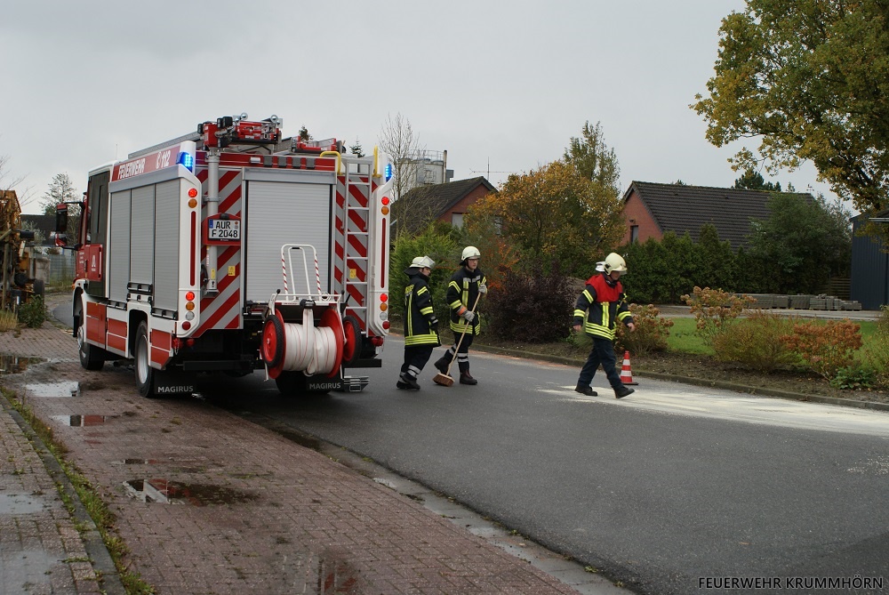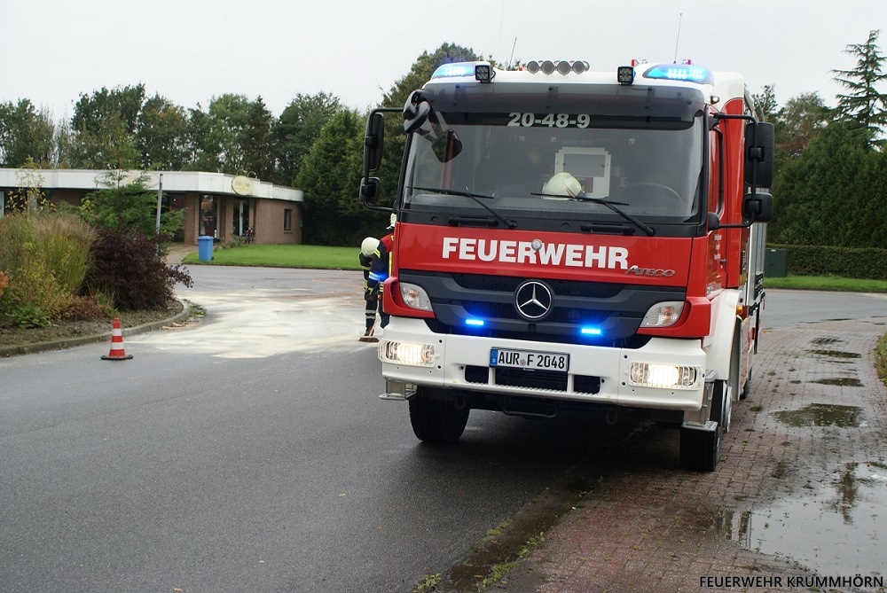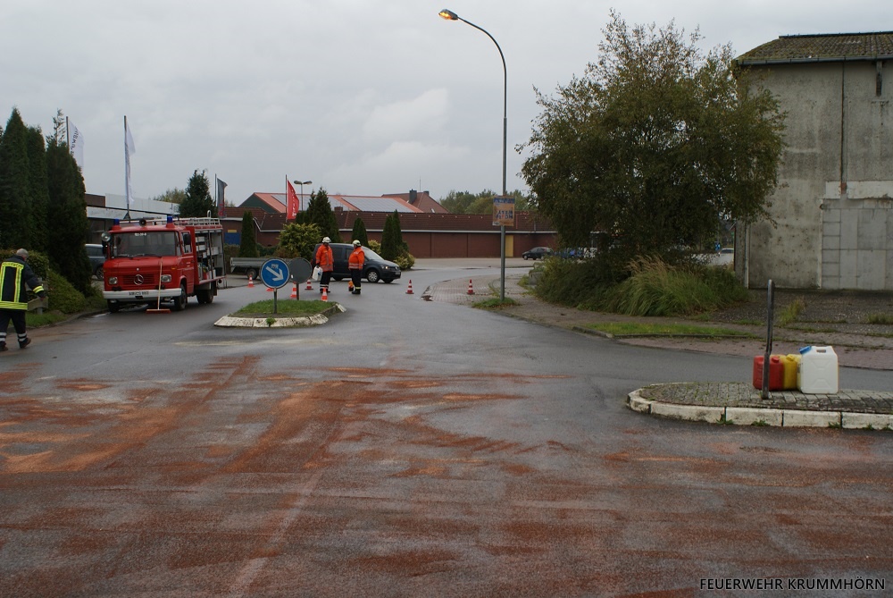 Fast pünktlich zur Mittagszeit alarmierte die Kooperative Regionalleitstelle Ostfriesland die Ortsfeuerwehr Manslagt - Pilsum zu einem Ölschaden in die Raiffeisenstraße in Pewsum. Dort fanden die Einsatzkräfte eine größere Ölspur vor, die sich über den gesamten Kreuzungsbereich Raiffeisenstraße;Adolf-Köppe-Straße zog. Zur weiteren Unterstützung forderten die Einsatzkräfte der Feuerwehr Manslagt - Pilsum die Feuerwehr Pewsum - Woltzeten über die Leistelle Ostfriesland nach.