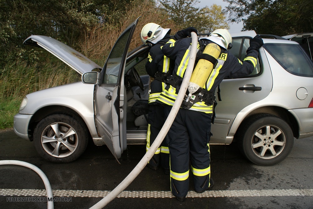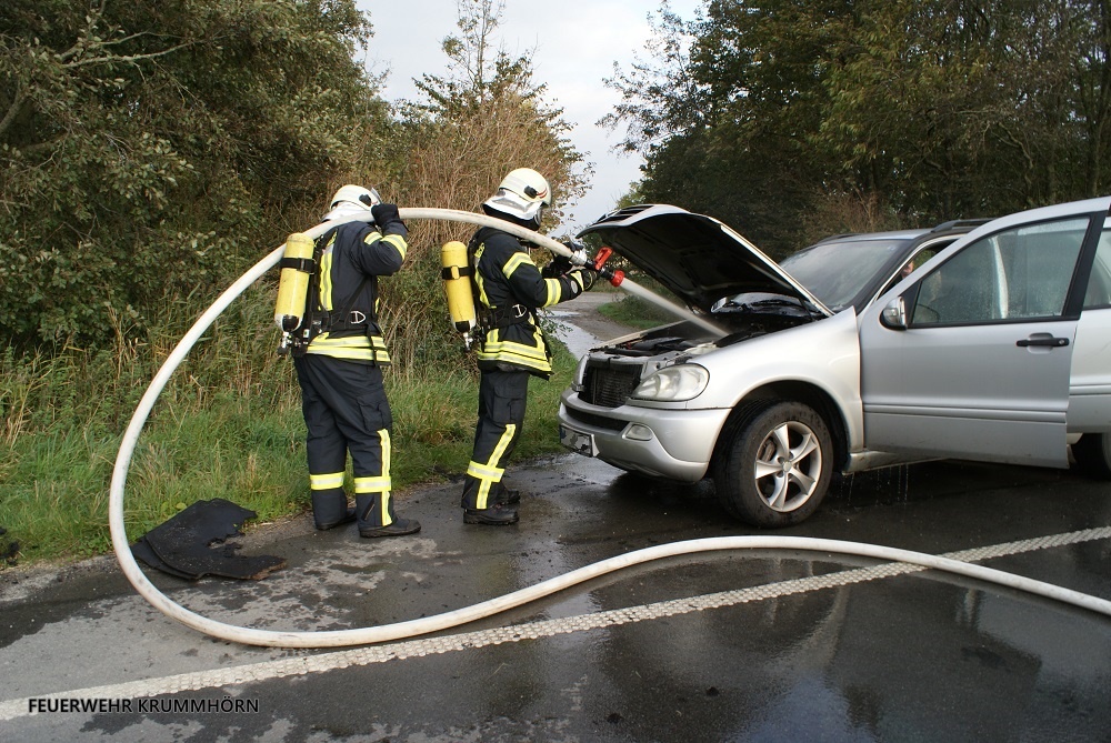 Der Motorraum eines PKW stand in Brand. Passanten unternahmen vor dem Eintreffen der Feuerwehr bereits erste Löschversuche. Nachdem die ersten Einsatzkräfte der Feuerwehr an der Einsatzstelle eintrafen, begannen diese umgehend mit den Löscharbeiten. Ein Trupp ging unter Atemschutz mit einem C-Rohr zur Brandbekämpfung vor.