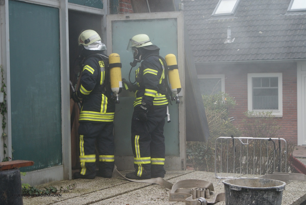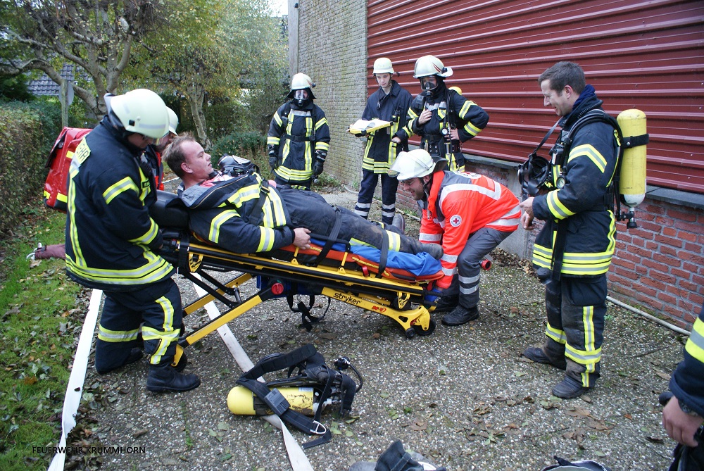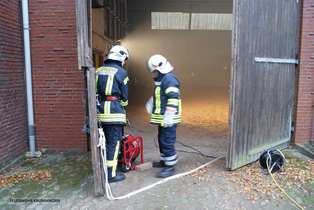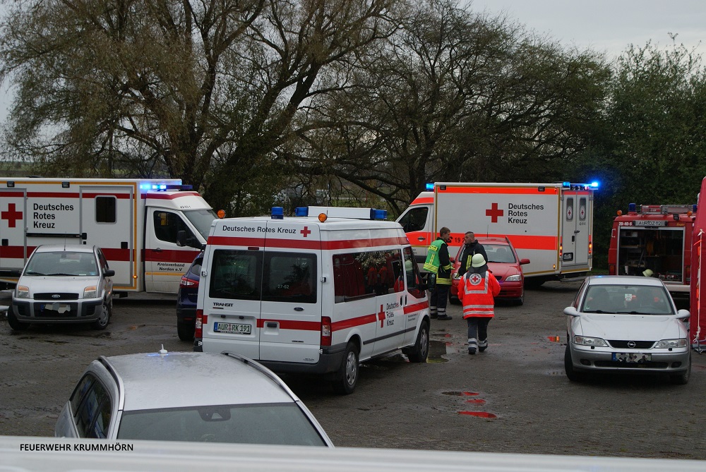 Kurze Zeit später meldete sich die Eigentümerin beim Einsatzleiter. Zwei Personen seien ins Archiv geschickt worden, um Akten zu holen. Dort sei es zu einem Brand gekommen, seit dem habe man nichts mehr von den Personen gehört. Umgehend setzte man Trupps unter Atemschutz zur Menschenrettung ein. Gleichzeitig ließ der Einsatzleiter die Alarmstufe erhöhen. Somit wurden die Feuerwehr Jennelt - Uttum, der in Pewsum stationierte Einsatzleitwagen 1, der in Norden stationierte Einsatzleitwagen 2 sowie das DRK Krummhörn mit dem Stichwort "Feuer Betriebsgebäude mit Menschenleben in Gefahr" nachalarmiert.