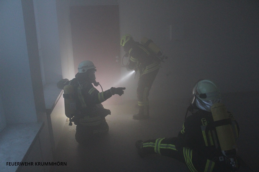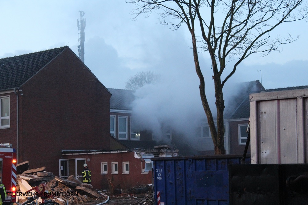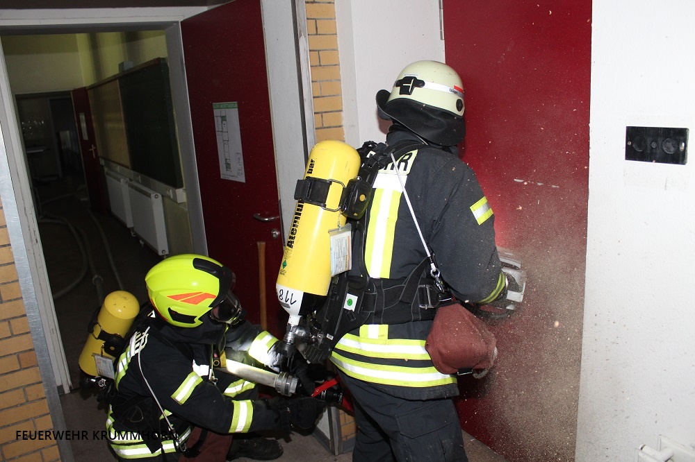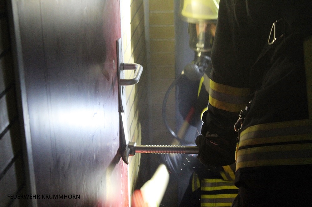 Beim Eintreffen der ersten Einsatzkräfte bestätigte sich die gemeldete Lage. Im Innenhof des ehemaligen Johannes-Althusius-Gymansiums (JAG) in Pewsum brannte es. Das Feuer hatte bereits auf das Gebäude übergegriffen. Umgehend löschten die Einsatzkräfte das Feuer im Innenhof ab und verschafften sich zeitgleich von der anderen Seite einen Zugang in das Gebäude. Trupps unter Atemschutz wurden eingesetzt, um das Gebäude zu kontrollieren, die Brandbekämpfung einzuleiten und nach vermissten Personen zu suchen. Die Türen in dem Gebäude bereiteten den Atemschutztrupps einige Schwierigkeiten, da diese verschlossen waren und geöffnet werden mussten. Mit einer Kettensäge verschafften sich die eingesetzten Trupps Zugang zu den verschlossenen Räumen. Neben der Kettensäge kam auch das "Halligan Tool" zum Einsatz. Ein Hochdrucklüfter wurde in Stellung gebracht, um das Gebäude zu belüften. Nach und nach retteten die Atemschutzgeräteträger zwei Personen aus dem verrauchten Gebäude.
