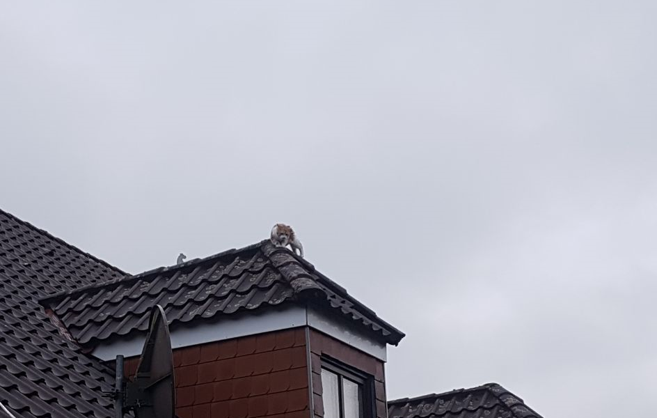 Am Sonntagmorgen um 8.10 Uhr wurde die Feuerwehr Eilsum-Grimersum zu einer Tierrettung alarmiert. Bereits seit dem Vortag befand sich eine Katze auf dem Dach eines ehemaligen Hofgebäudes in der Hofstrasse in Eilsum. Nach Ankunft der Einsatzkräfte konnte die völlig verängstigte und durchnässte Katze auf dem Giebel des Gebäudes ausgemacht werden. Kurzerhand wurde die Steckleiter in Stellung gebracht, sodass der mit einer Rettungsleine gesicherte Angriffstrupp übers Dach zu dem Tier vorgehen konnte. Beim Tier angelangt, trat dieses die Flucht auf die andere Dachseite des Gebäudes an, wo es schlussendlich erfolgreich gerettet werden konnte. Gegen 9.00 Uhr konnte an die Leitstelle die Rückmeldung gegeben werden: "Katze erfolgreich vom Dach gerettet, Mannschaft und Katze wohlauf."