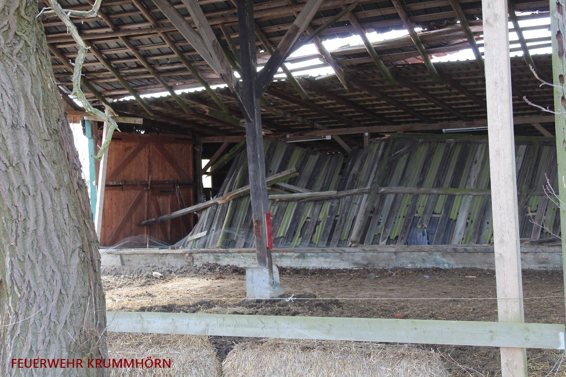 Am Samstag, den 17.03.2018, wurde gegen 13:30 Uhr die Ortsfeuerwehr Manslagt - Pilsum zu einem Sturmschaden alarmiert. Eine Wand in einer Scheune war eingestürzt. Weitere Teile des Scheunendaches drohten einzustürzen.