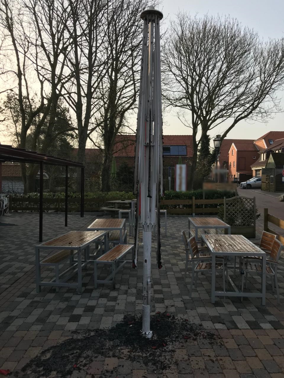 Beim Eintreffen der Feuerwehr war der Schirm fast vollständig abgebrannt. Die 6 ausgerückten Einsatzkräfte führten Nachlöscharbeiten durch.