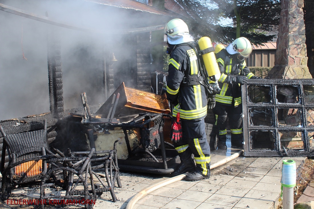 Ein Trupp unter Atemschutz brachte den Brand schnell unter Kontrolle. Durch das schnelle Eingreifen der Feuerwehr konnte eine Brandausbreitung verhindert werden. Im Rahmen der Löscharbeiten wurden mehrere Möbel nach draußen befördert und weiter abgelöscht. Zudem kontrollierten die eingesetzten Feuerwehrleute mit der Wärmebildkamera das, in Brand geratene, Gartenhaus auf weitere Glutnester.