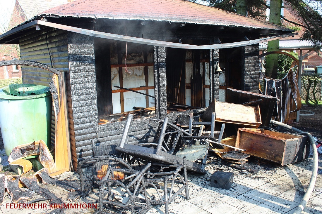 Bereits auf der Anfahrt zum Einsatzort war eine starke Rauchentwicklung zu erkennen. Vor Ort brannte ein Gartenhaus in einem Garten.