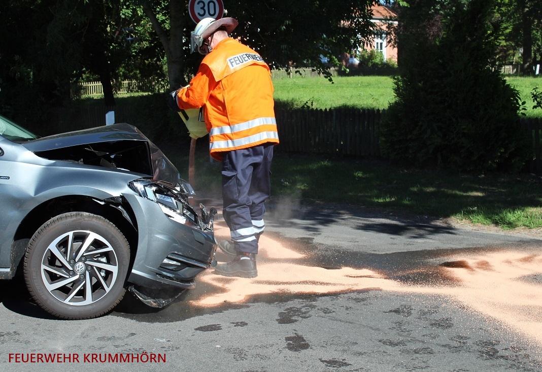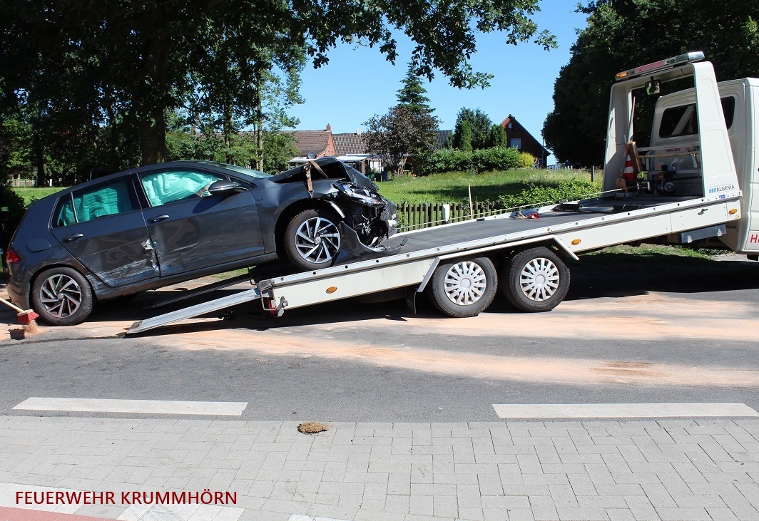 Auf Grund der auslaufenden Betriebsstoffe wurde gegen 08:55 Uhr die Feuerwehr Krummhörn-West alarmiert. Die Feuerwehr Krummhörn-West sperrte die Van Wingene Straße ab und forderte die Ölschadensgruppe der Feuerwehr Krummhörn-Nord an, um die auslaufenden Betriebsstoffe aufzunehmen. Der Rettungsdienst, der bereits vor Ort war, versorgte die Fahrerin des verunfallten PKWs und transportierte diese anschließend.