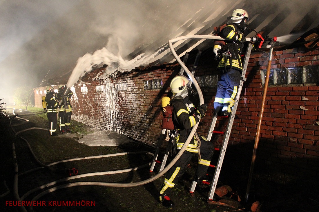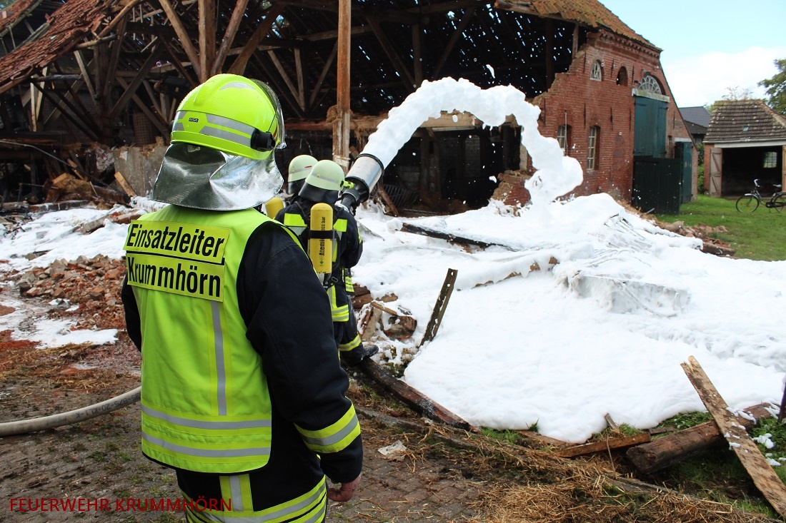 Rund 100 Einsatzkräfte der Feuerwehren Krummhörn-Nord, Krummhörn-Ost, Visquard, Pewsum-Woltzeten, der Versorgungsgruppe der Feuerwehr Krummhörn-West sowie der Einsatzleitwagen der Gemeinde Krummhörn waren von Dienstagnacht bis Dienstmittag bei einem Scheunenbrand in Manslagt im Einsatz.