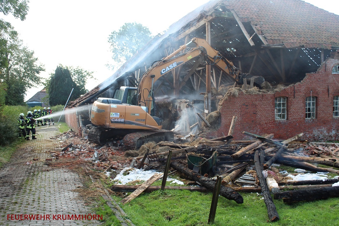 In den Morgenstunden wurde eine Baggerfirma an die Einsatzstelle beordert, die das Brandgut auf ein Feld gefahren hat. Dort zogen einige Einsatzkräfte das Brandgut auseinander und löschten letzte Glutnester ab. Im Nachgang wurde die Scheune in einem Teilbereich mit Löschschaum bedeckt, um auch letzte Glutnester im Inneren zu bekämpfen.