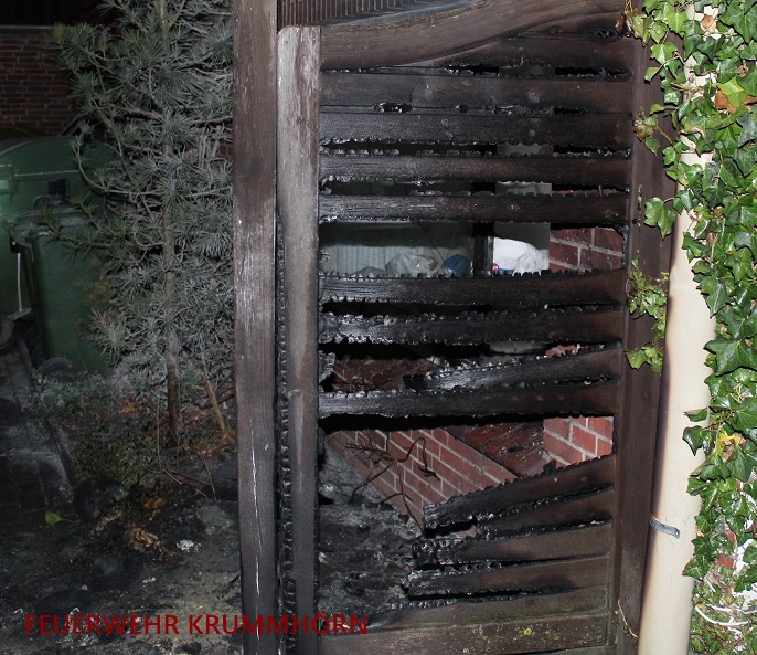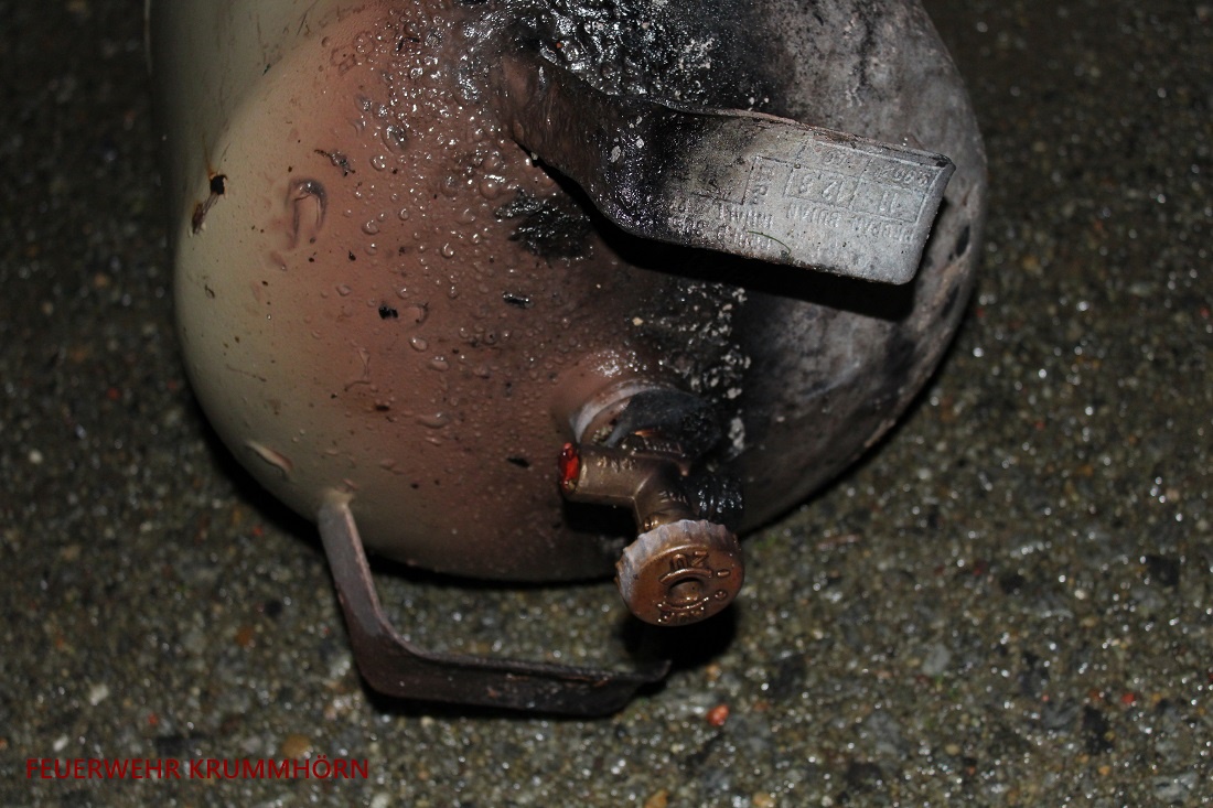 Als die Feuerwehren vor Ort eintrafen, war das Feuer bereits durch die Nachbarn mit Hilfe eines Feuerlöschers und Wasser abgelöscht worden. Eine Druckgasflasche blies durch die enorme Hitzeeinwirkung Gas ab. Eine Fensterscheibe war durch die entstandene Hitze gesprungen.