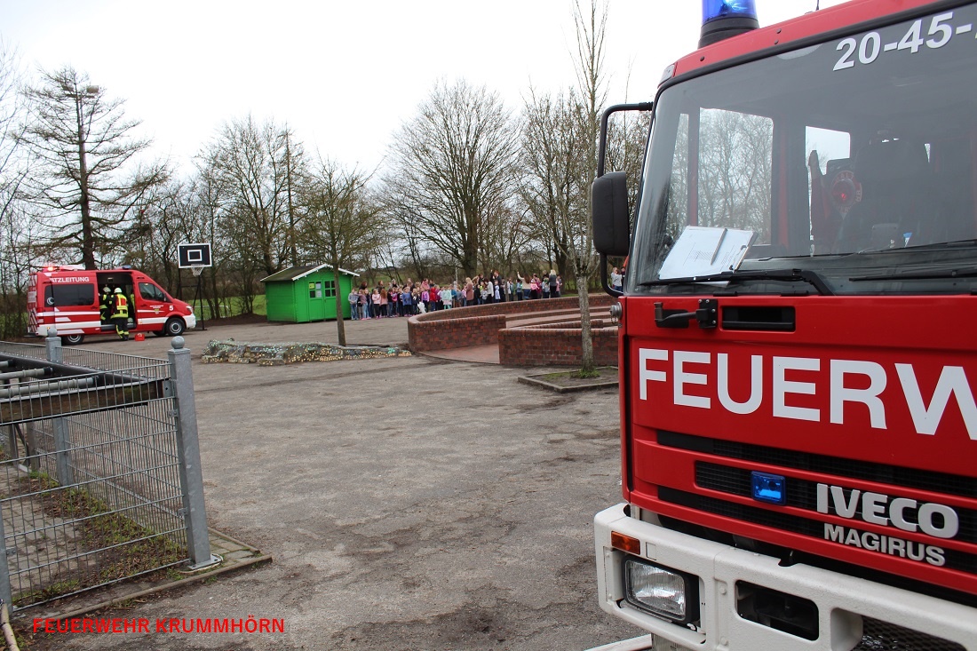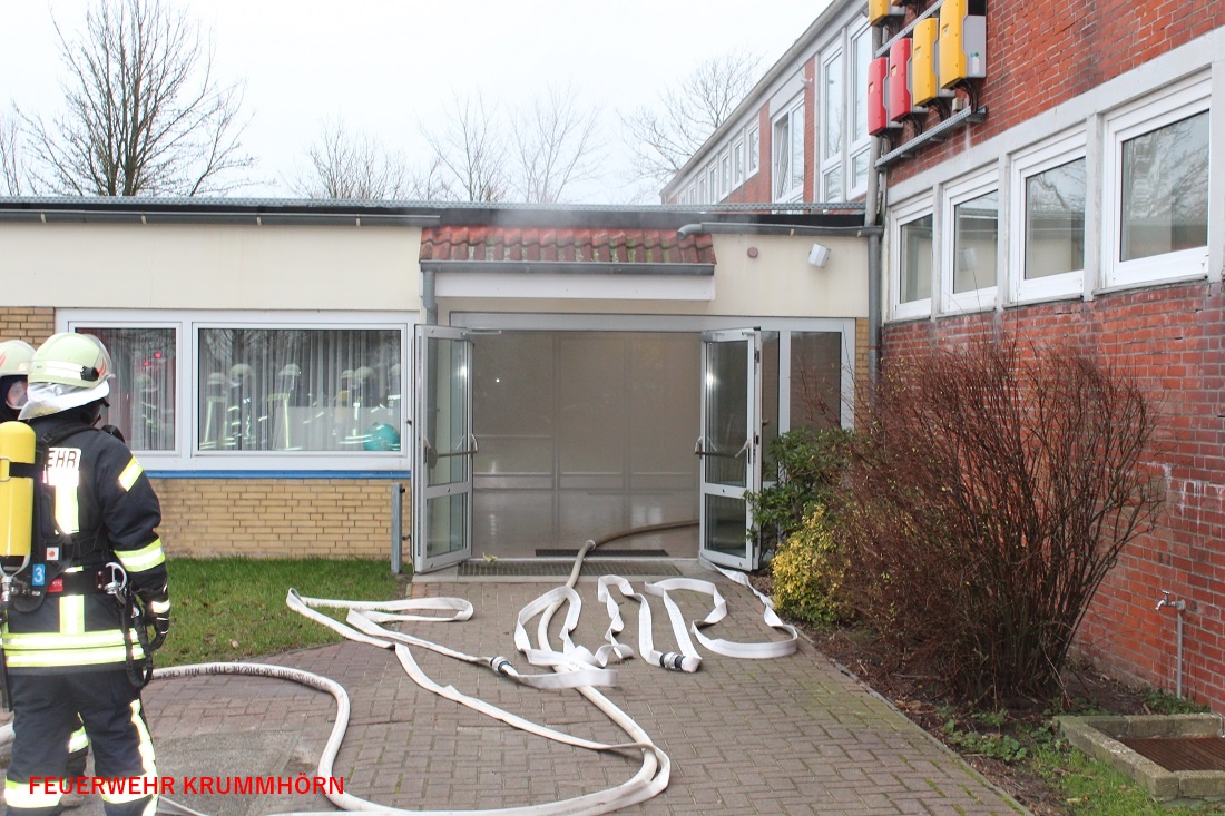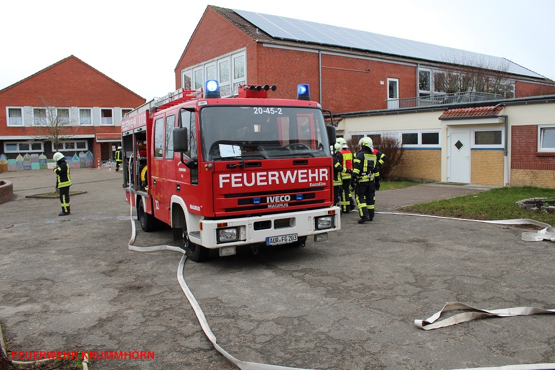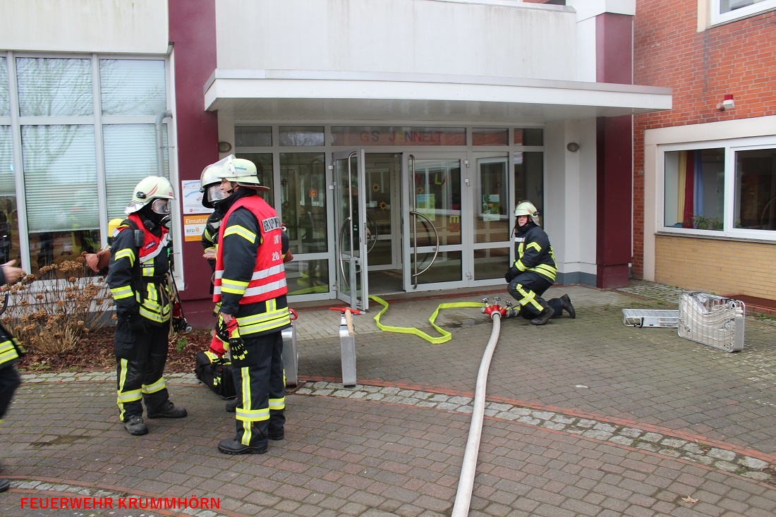 Aufgrund einer unklaren Rauchentwicklung im Keller der Jennelter Grundschule wurden die Feuerwehren Krummhörn-Ost, Krummhörn-Nord, Visquard und die Einsatzleitwagen-Gruppe um 10:38 Uhr mit dem Stichwort "Kellerbrand Menschenleben in Gefahr" zur Jennelter Grundschule alarmiert. Die Schule wurde zu diesem Zeitpunkt von 120 Schülerinnen und Schülern besucht. Die Brandmeldezentrale und der damit verknüpfte Hausalarm der Grundschule sowie des Kindergartens wurden aktiviert. Der angrenzende Kindergarten wurde, wie auch die Schule, evakuiert. Hier führten die Mitarbeiter des Kindergartens 35 Kinder zum Sammelplatz.