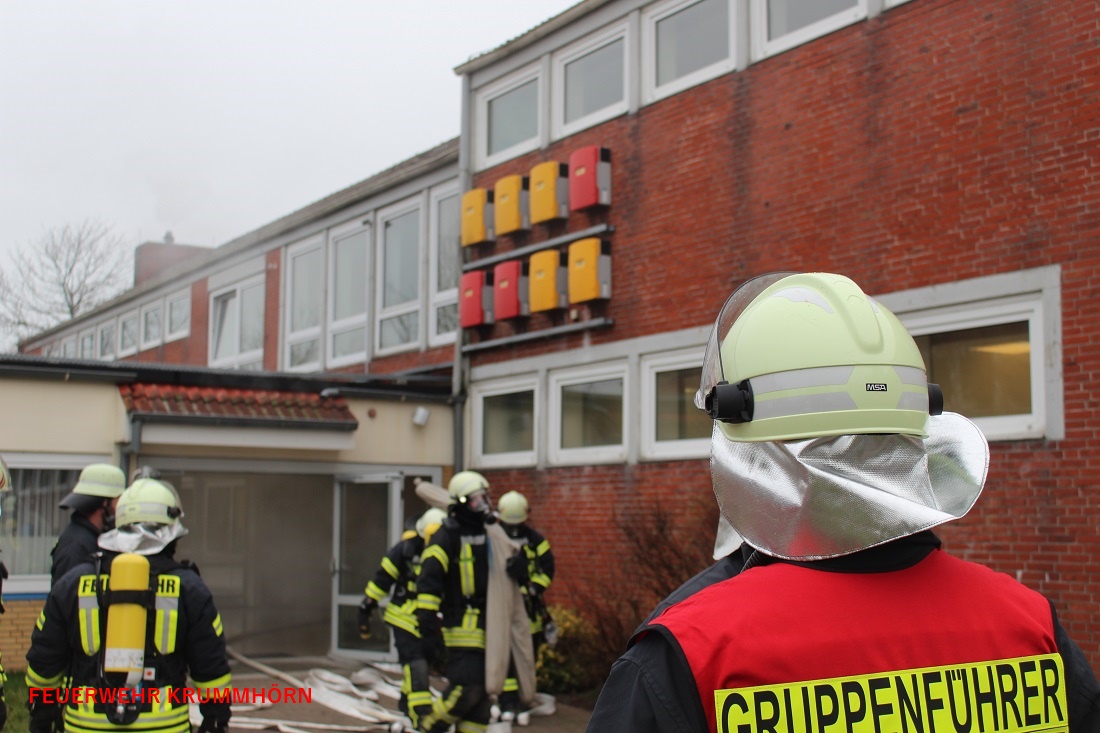Kellerbrand in der Jennelter Schule, Menschenleben in Gefahr - Dieses Einsatzszenario beschäftigte viele Krummhörner Feuerwehrleute am Donnerstag. Keiner der Einsatzkräfte ahnte zunächst, dass es sich hierbei um eine unangekündigte Alarmübung handelte.
