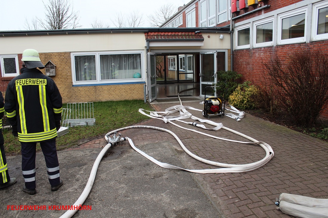 Als die Feuerwehr Krummhörn-Ost an der Einsatzstelle eintraf, wurden die Einsatzkräfte mit der Einsatzlage konfrontiert. Im Heizungskeller war es zu einer Verpuffung gekommen. Die vier dort arbeitenden Techniker wurden seitdem vermisst.