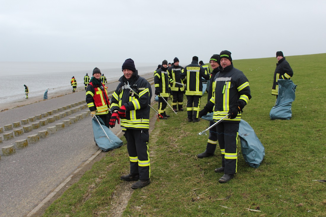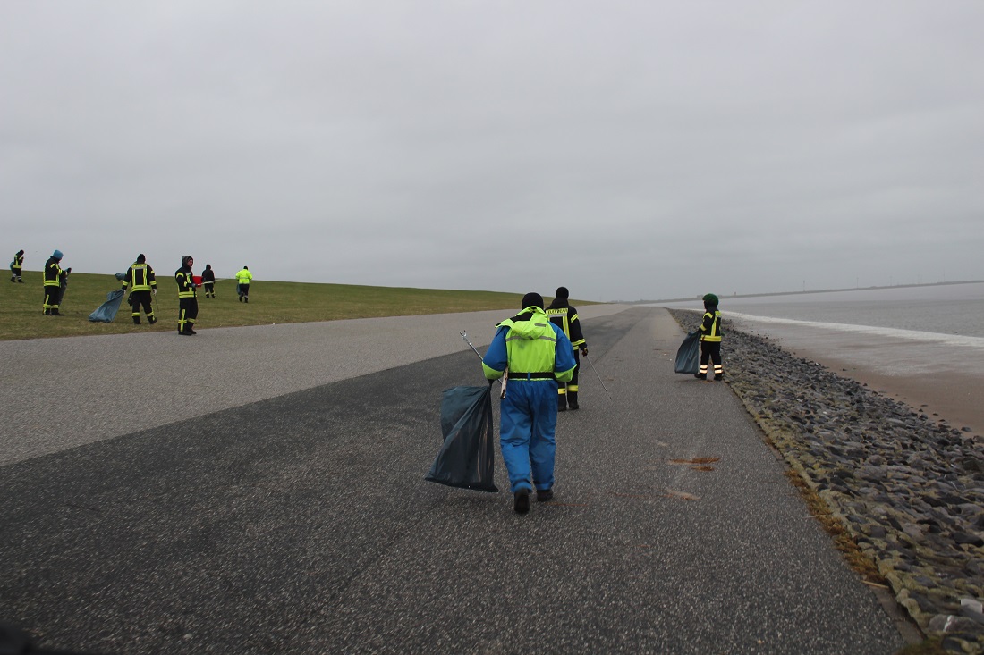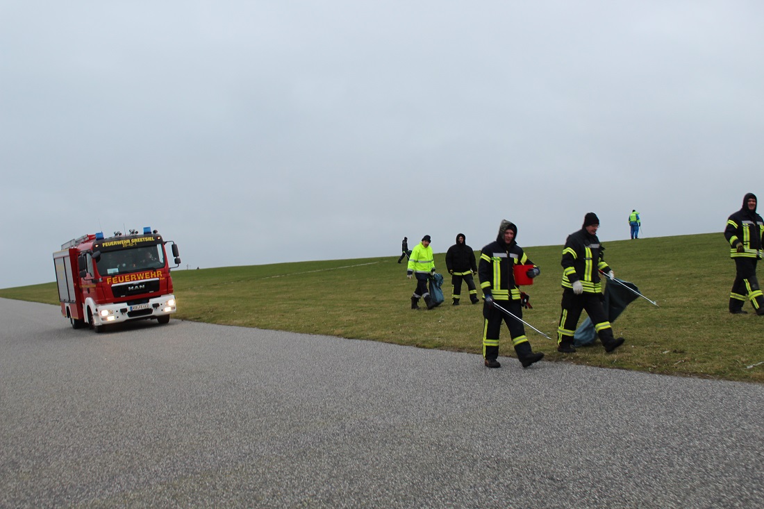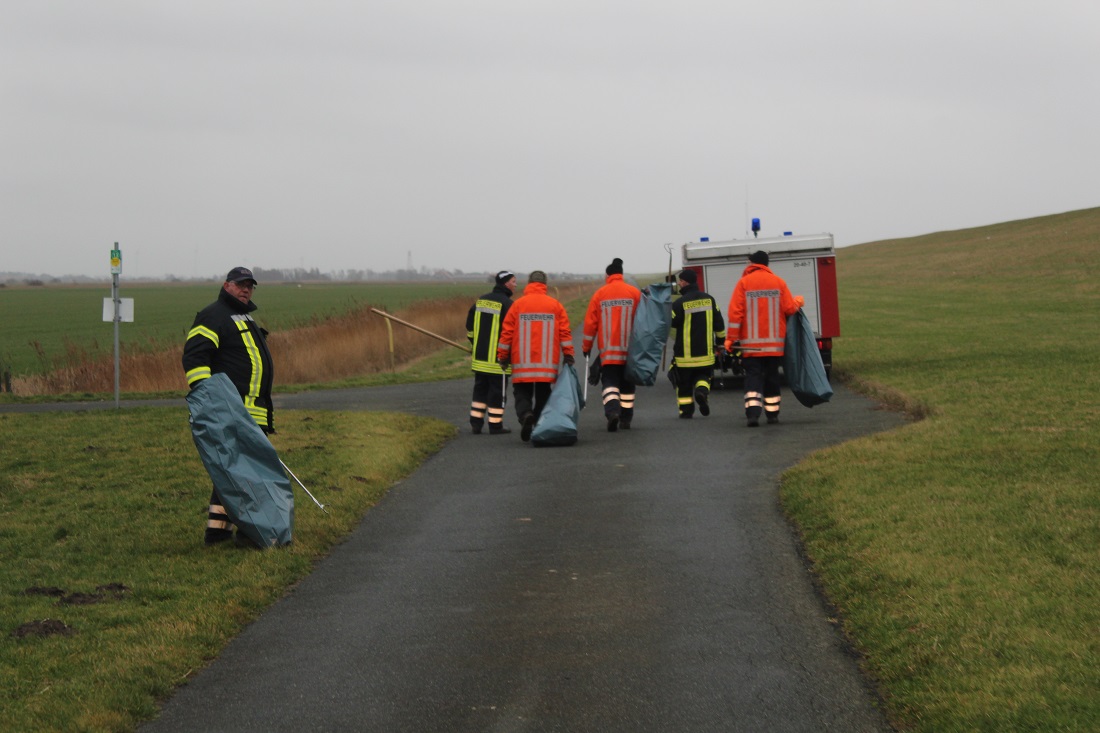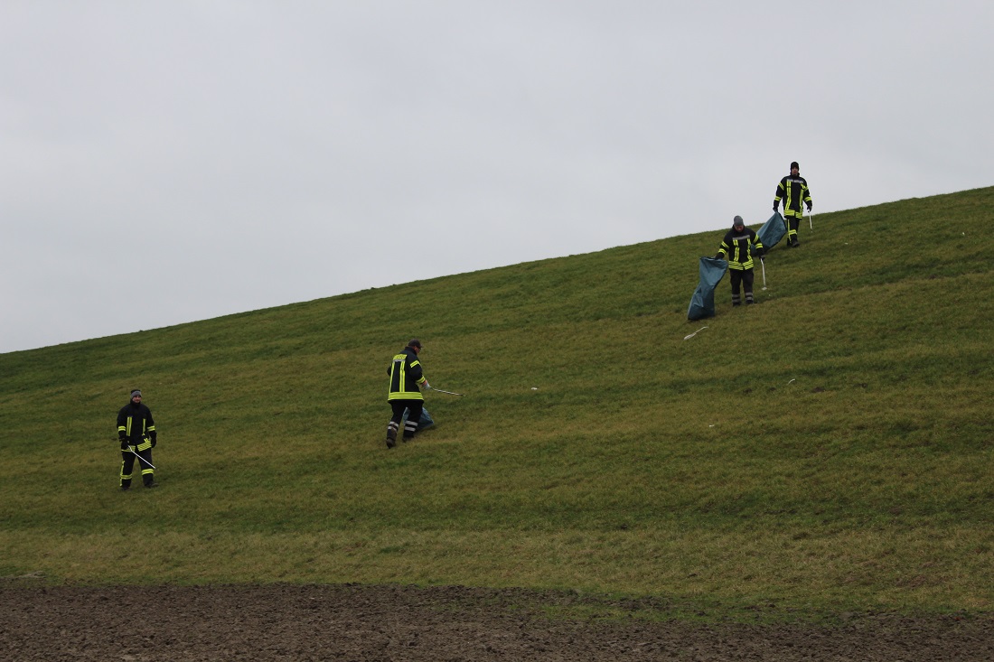 Am Dienstagmorgen erfolgte dann der Gemeindealarm (dies bedeutet, dass alle Mitglieder der Gemeindefeuerwehr Krummhörn über die digitalen Meldeempfänger alarmiert werden). Nach und nach trafen die Einsatzkräfte am Deich ein. Gegen 08.30 Uhr begannen die Feuerwehrleute dann mit dem Aufsammeln des Mülls. Hierzu wurden durch die Deichacht Krummhörn etliche Müllgreifer und Müllsäcke gestellt.