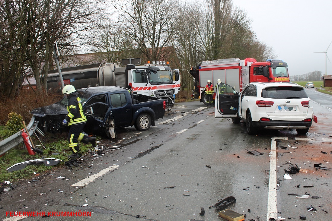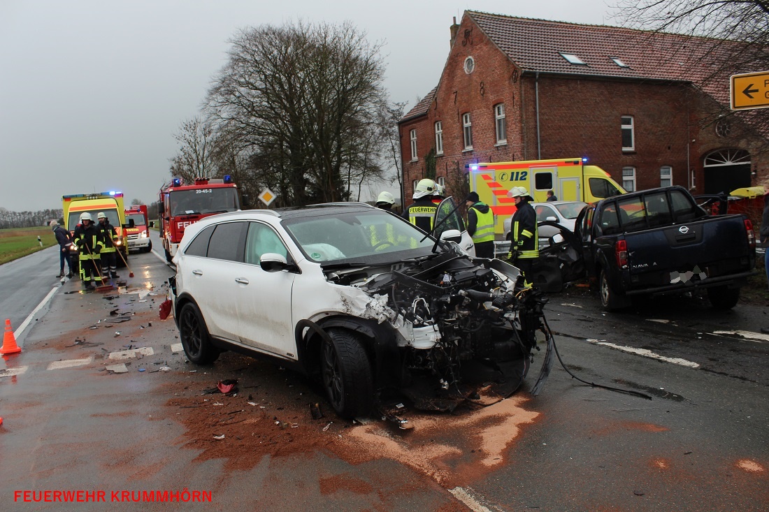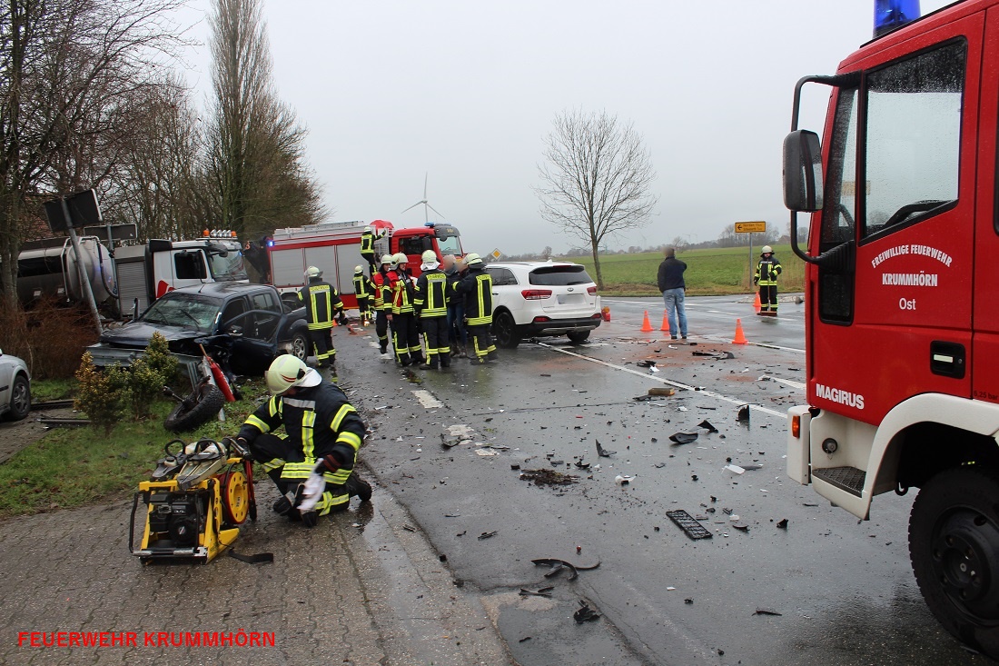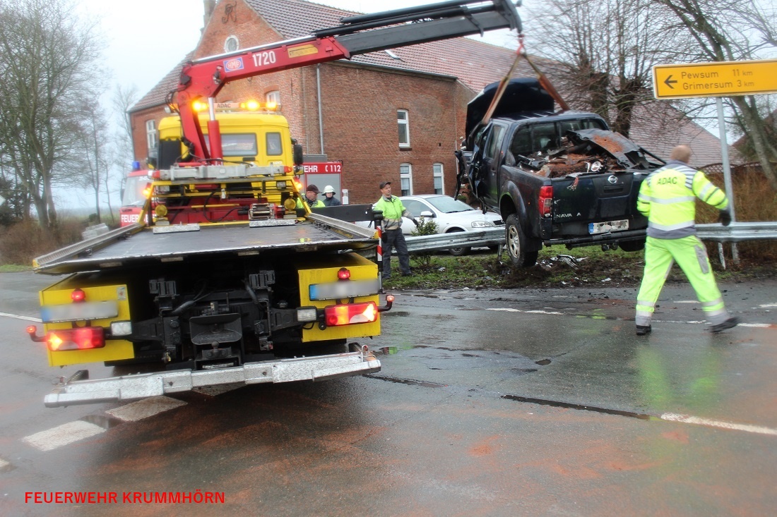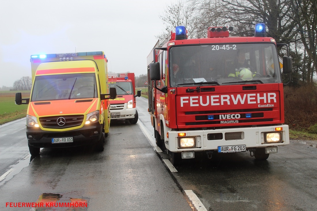 Am Montagnachmittag, 28.01.2019, wurden die Feuerwehren Krummhörn-Ost, Pewsum-Woltzeten und der in Norden stationierte Rüstenwagen-Kran des Landkreises Aurich um 13:43 Uhr mit dem Stichwort "Verkehrsunfall mit eingeklemmter Person" alarmiert.