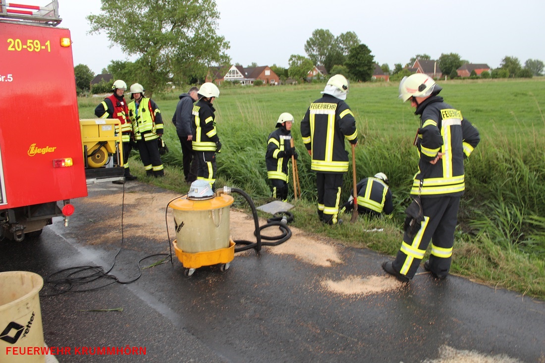 Nach Rücksprache mit einem Mitarbeiter der Unteren Wasserbehörde wurde eine größere Menge an Öl, die sich in dem Graben befand, mit Hilfe eines Öl-Wasser-Saugers aufgesaugt und anschließend durch den Bauhof der Gemeinde Krummhörn abtransportiert.