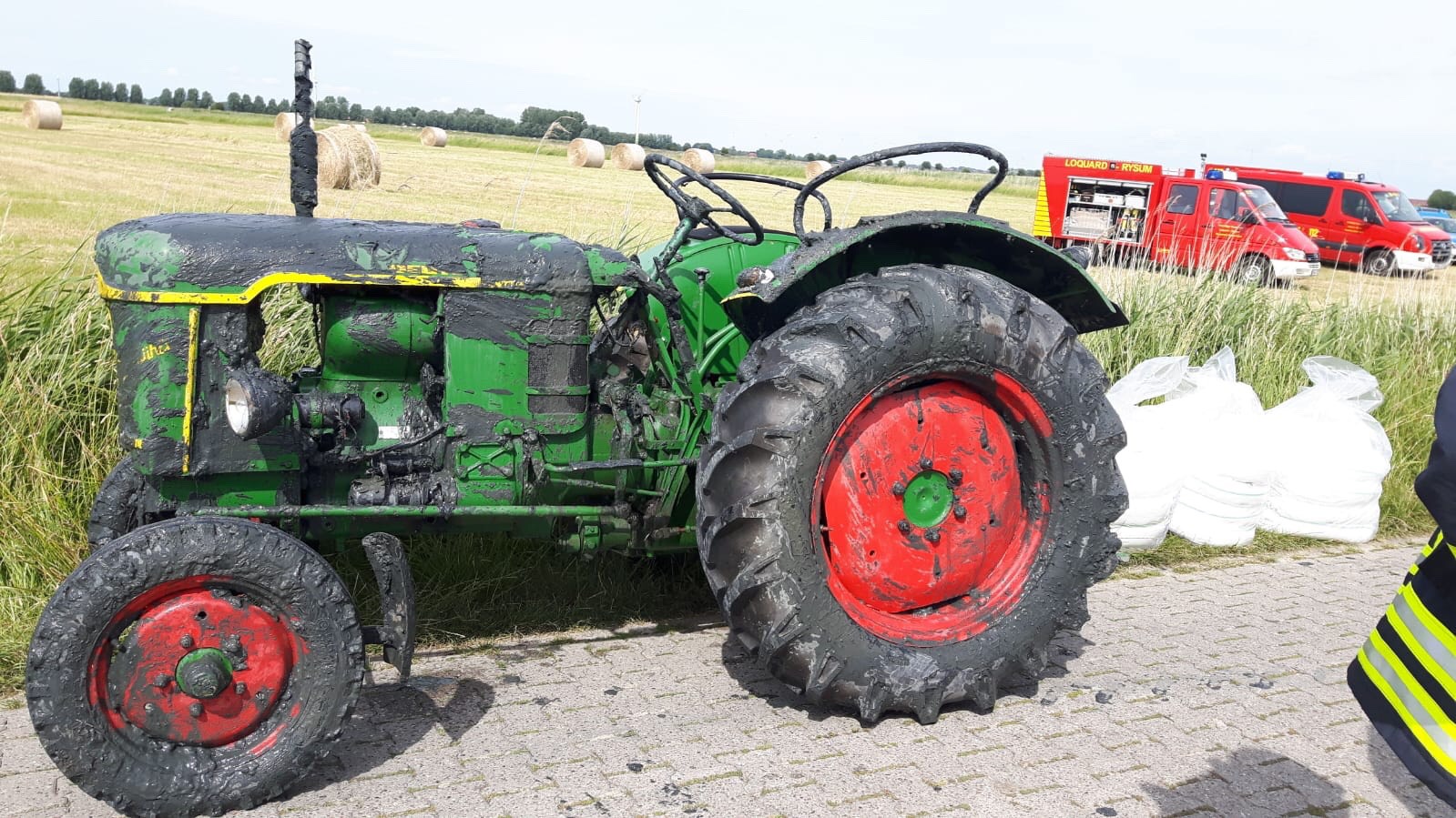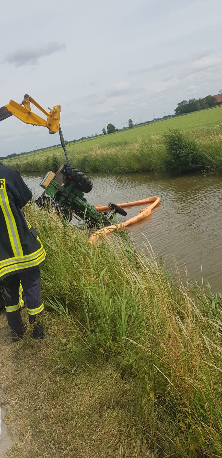 Am Donnerstagnachmittag um 15:18 Uhr wurde die Freiwillige Feuerwehr Krummhörn-Süd zu einer technischen Hilfeleistung nach einem Verkehrsunfall alarmiert. Im neuen Meedeweg in Campen war ein Traktor in das Campener Tief gerutscht. Noch auf Anfahrt wurde die Freiwillige Feuerwehr Krummhörn-Nord mit der Ölschadensgruppe nachalarmiert, um Ölsperren auf dem Gewässer auszulegen. Mit einem Boot und 2 Einsatzkräften wurden Ölsperren um den Traktor ausgelegt, um weitere Umweltschäden abzuwenden. Mithilfe eines Teleskopladers wurde der Traktor dann aus dem Kanal gehoben und auf die Straße gestellt, der Einsatz endete nach gut eineinhalb Stunden. Im Einsatz waren zirka 30 Einsatzkräfte, sowie die Polizei und die Untere Wasserbehörde des Landkreises Aurich. Der Fahrer des landwirtschaftlichen Fahrzeugs blieb unverletzt.