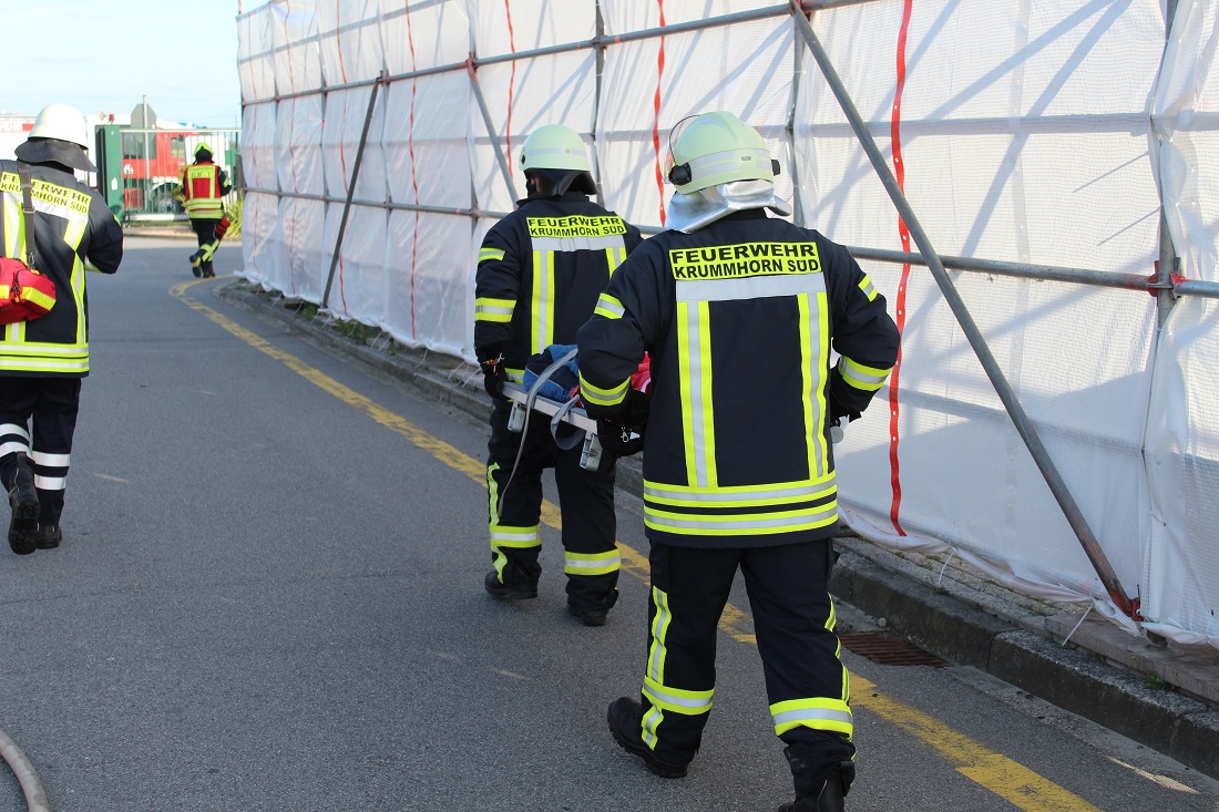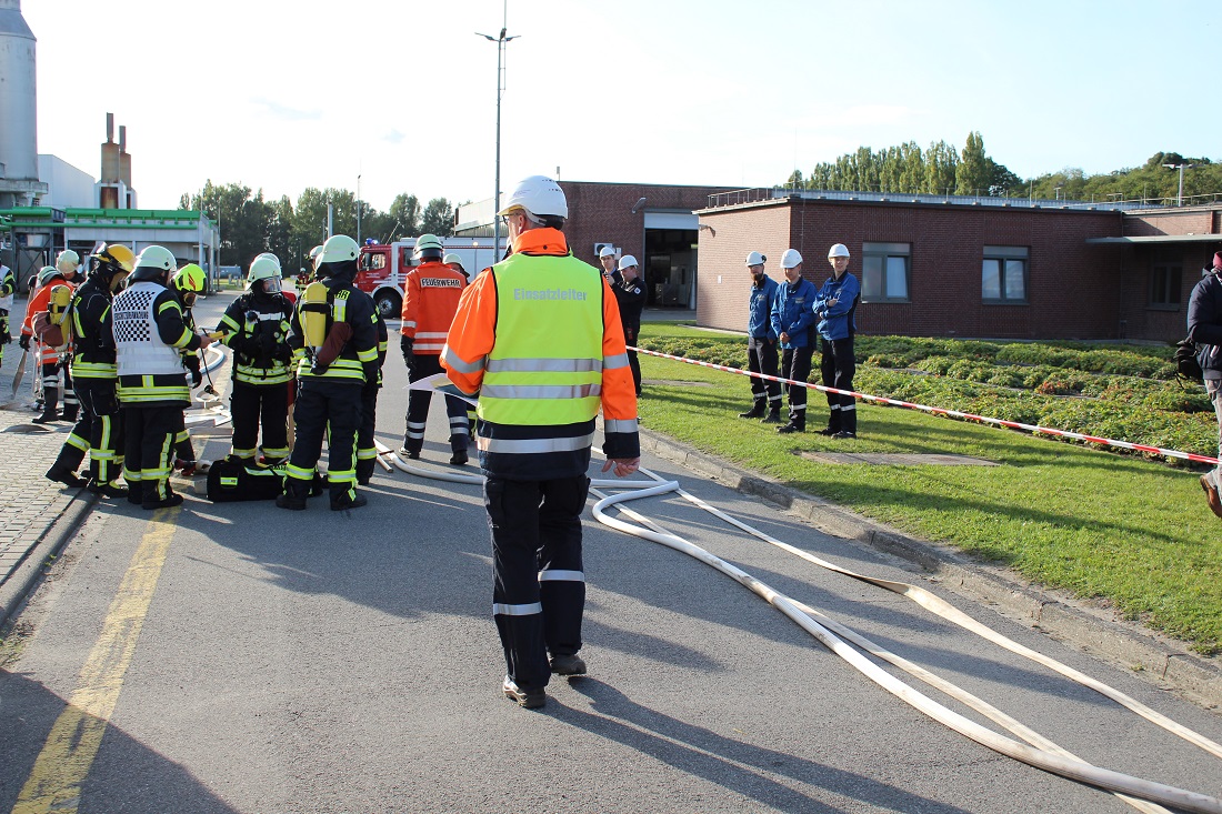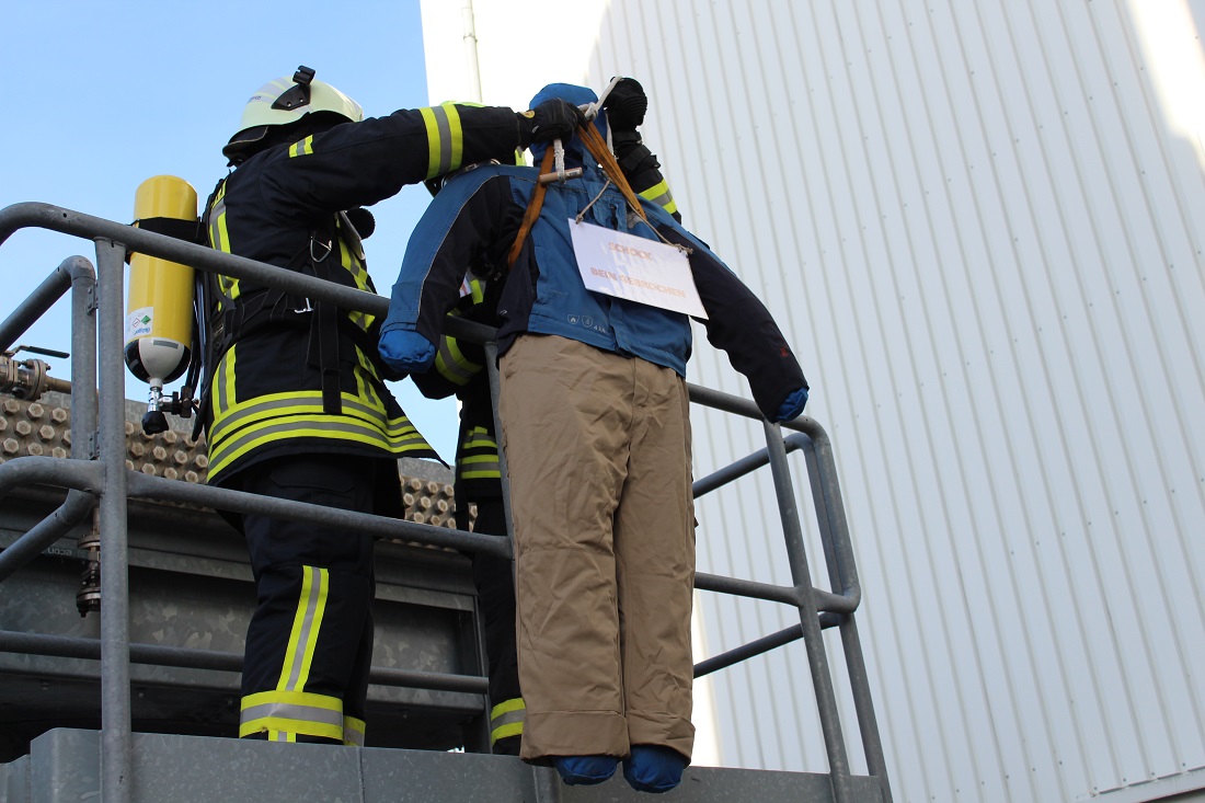 Während die ersten Trupps in das Innere der Verdichterhalle vorgingen, kamen weitere Szenarios hinzu. Eine Person mit einem gebrochenen Bein musste von einem Ölkühler gerettet werden und ein Mitarbeiter musste aus dem Gefahrenbereich geführt und anschließend betreut werden.