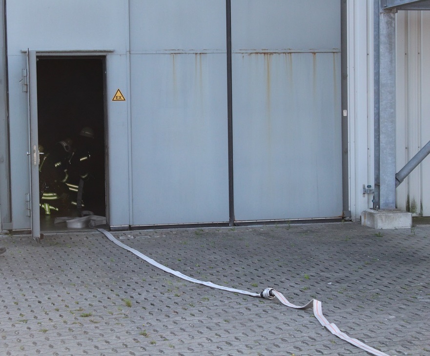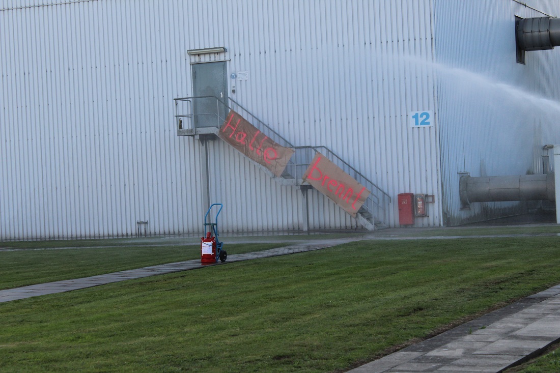 Hinzu kam ein simulierter Vollbrand einer weiteren Verdichterhalle. Die Einsatzkräfte gingen hier mit einem Außenangriff gegen den simulierten Vollbrand vor. Eine Acetylenflasche, die anhand der UN-Nummer erkannt werden musste, bereitete den Einsatzkräften Schwierigkeiten.