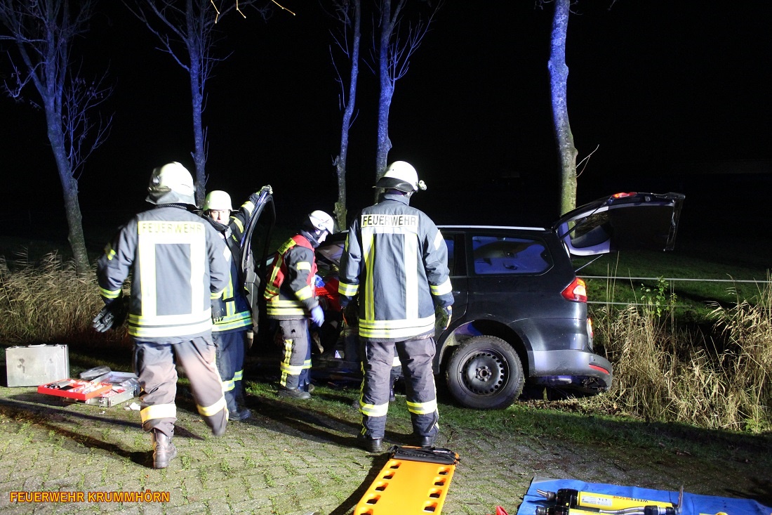 Ein Personenkraftwagen, in dem sich zwei Personen befanden, war von der Straße abgekommen. Der Fahrer konnte das Fahrzeug selbstständig verlassen. Der Beifahrer des verunfallten Kraftfahrzeugs befand sich beim Eintreffen der Rettungskräfte noch im Fahrzeug.