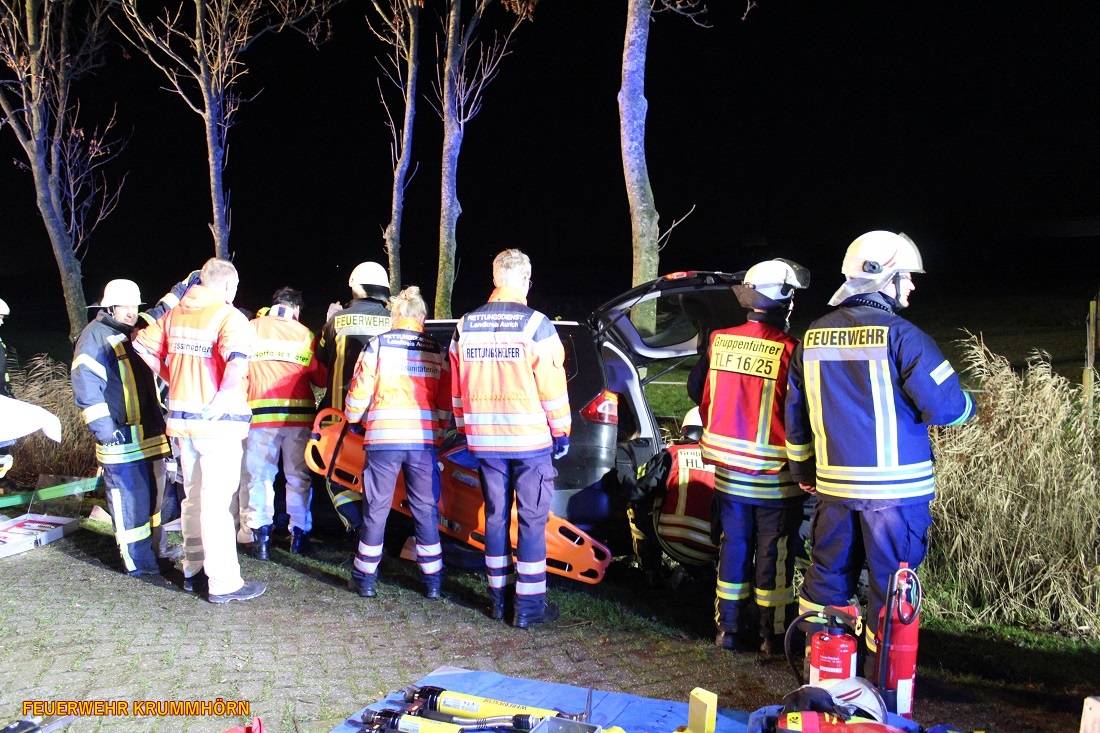 In der Piepenbrückstraße in Jennelt hat sich in der Nacht zu Dienstag ein Verkehrsunfall ereignet. Die Feuerwehren Krummhörn-Ost, Pewsum-Woltzeten und der in Norden stationierte Rüstwagen-Kran des Landkreises Aurich wurden daraufhin um 00:38 Uhr mit dem Stichwort "Verkehrsunfall mit eingeklemmter Person" alarmiert.