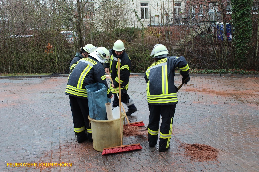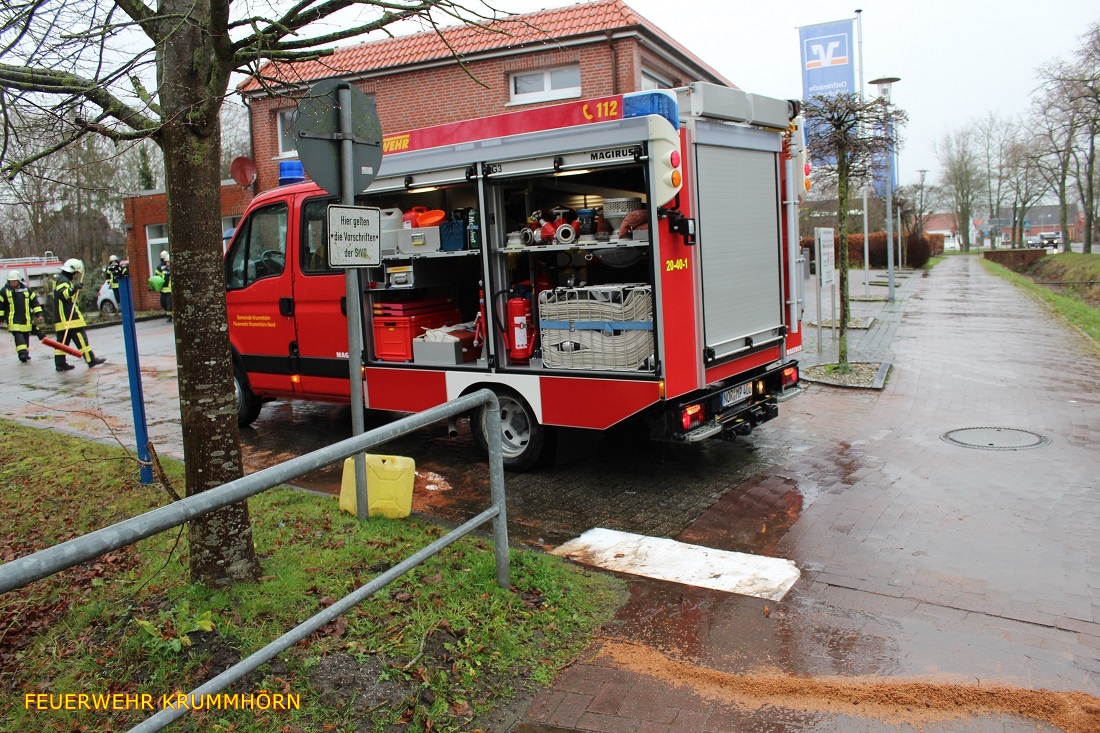 Die Ölschadensgruppe der Feuerwehr Krummhörn-Nord wurde am Dienstag, den 24.12.2019 um 12:08 Uhr zu einem mittleren Ölschaden in Pewsum alarmiert. Auf dem Parkplatz einer Bankfiliale in der Manningastraße war zuvor ein Personenkraftwagen mit einem Poller zusammengestoßen.